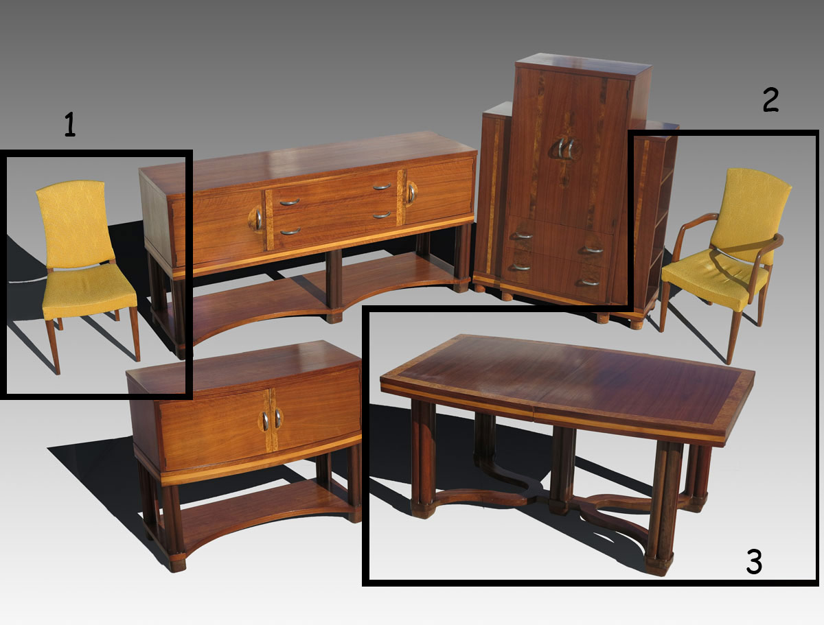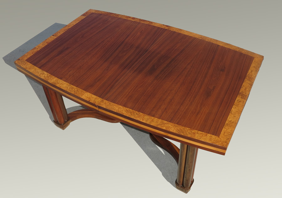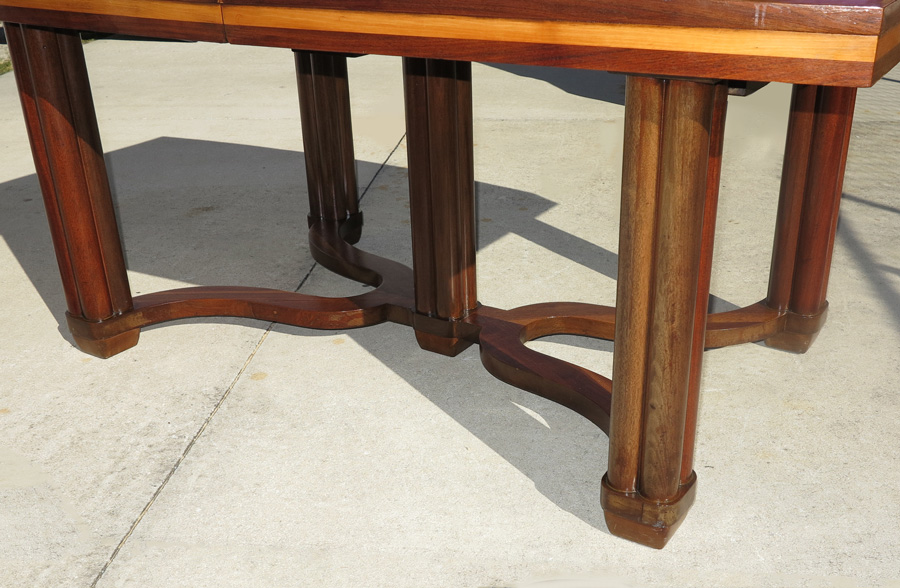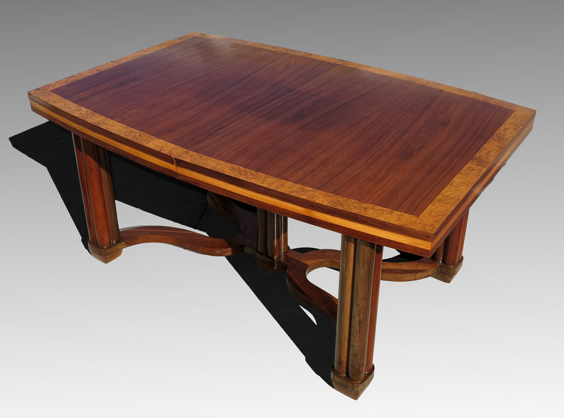PAUL FRANKL / JOHNSON FURNITURE CO. TABLE & 2 CHAIRS: Johnson Handley Johnson metal nameplate. attrib. Paul Frankl. To include Mahogany top table with burl border, fluted column legs and center pillar. 30 1/4'' h. x 64 3/4'' x 42''. 2 leaves 11 1/8'', in original case 44'' h. x 10 1/4'' x 12 1/2''. Sold with arm and side chair with yellow upholstery, arm chair 39'' h. x 21 3/4'' x 22''.