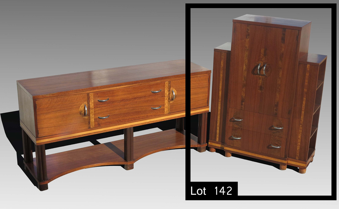 PAUL FRANKL / JOHNSON SKYSCRAPER SIDE CABINET: Attributed to Paul Frankl, by Johnson Handley Johnson. Mahogany with burl accents, 2 doors over 2 drawers with outward facing side shelves. Measures 55 1/4'' h. x 40 1/4'' x 16 1/2''.