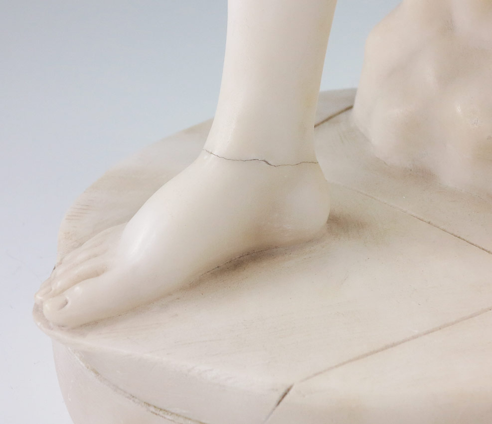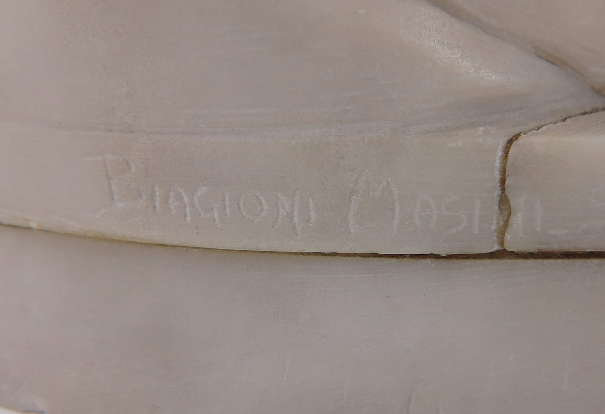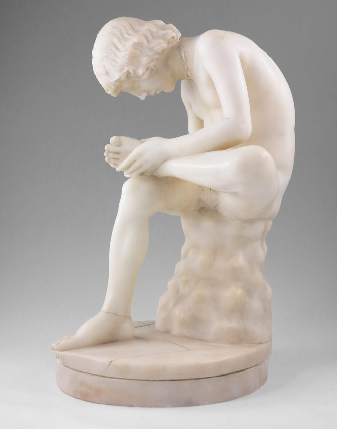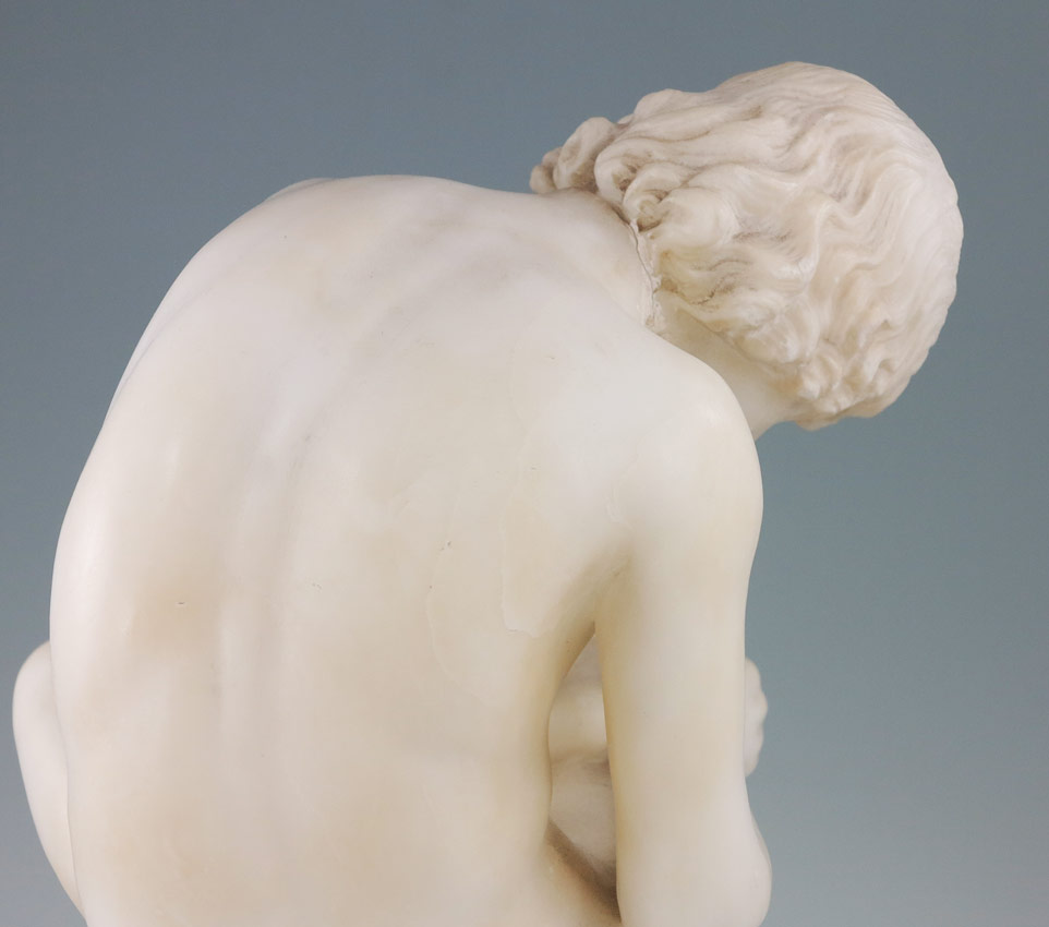 GOOD ALABASTER SCULPTURE BOY WITH THORN SIGNED BIAGIONI? MASINI: 13 3/4'', Depicts a young boy pulling a thorn from his foot, signed on the base. Sometimes called Fedele (Fedelino) or Spinario. Condition: Damaged, base, repair to neck and foot.
