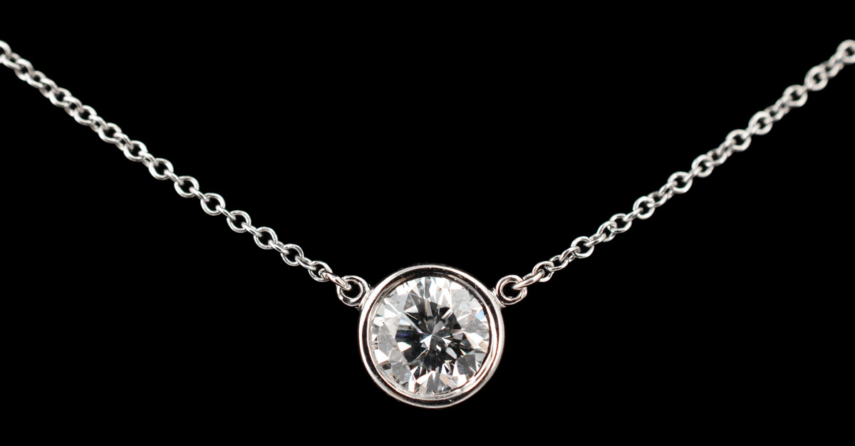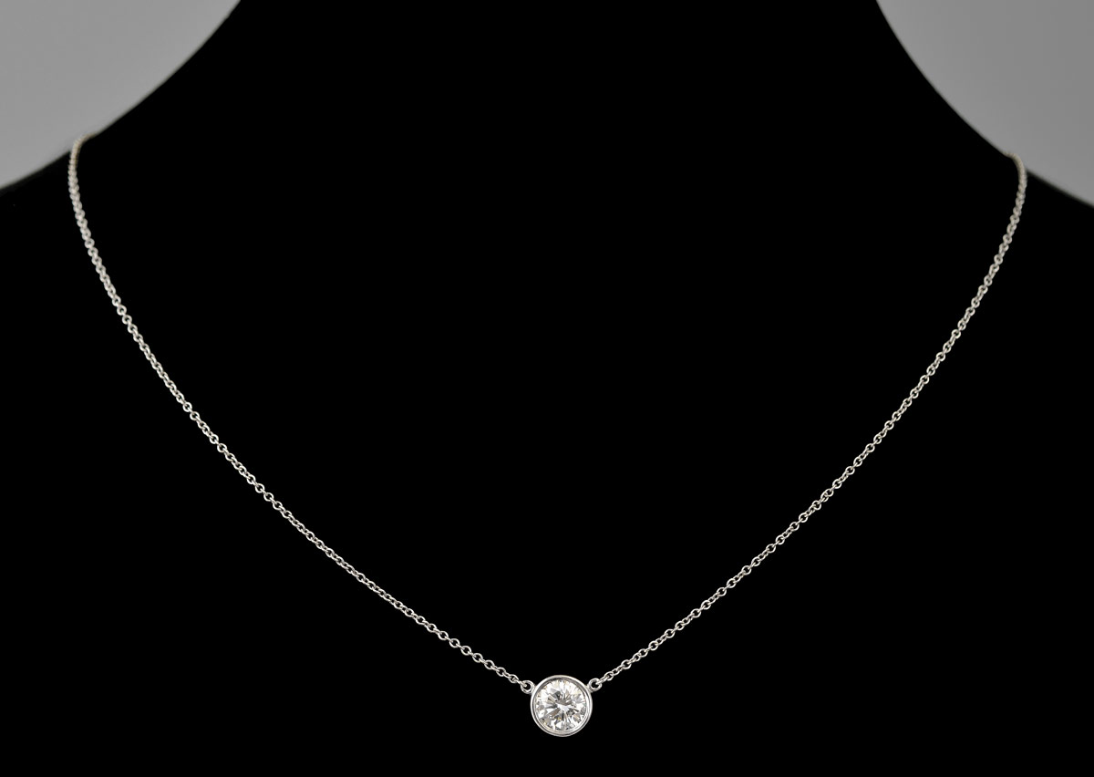 TIFFANY & CO PLATINUM DIAMOND SOLITAIRE PENDANT NECKLACE: An approx. .75 Ct. round brilliant cut diamond bezel set in platinum. Rated VVS2 in clarity and G color. 16'' anchor link chain. Weight 2.6 grams. Signed Tiffany & Co. Sold with current Florida Diamond Appraisers GIA graduates appraisal for $8,550.