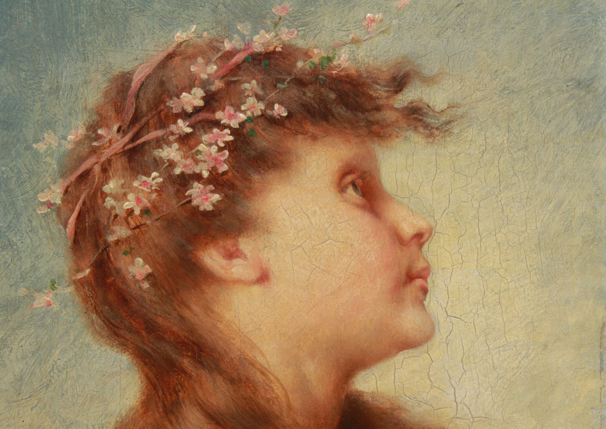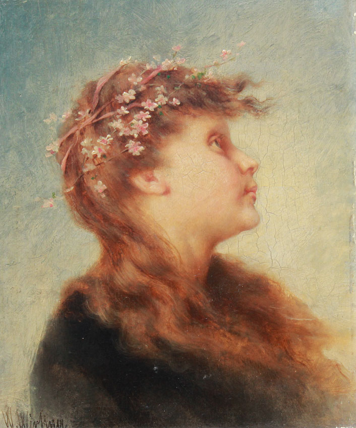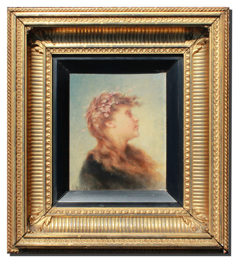 WIRKNER, Wenzel, (Austrian, 1864- ): Young Girl with Floral Tiara, Oil/Wood Panel, 7 1/2'' x 6 1/4'', signed lower right, period gilded gesso frame with minor wear, 14 1/2'' x 13 1/2''.