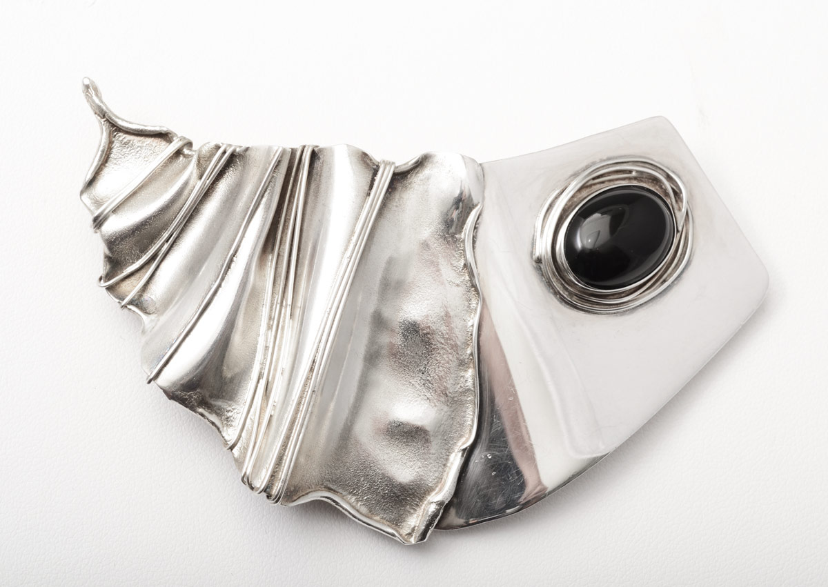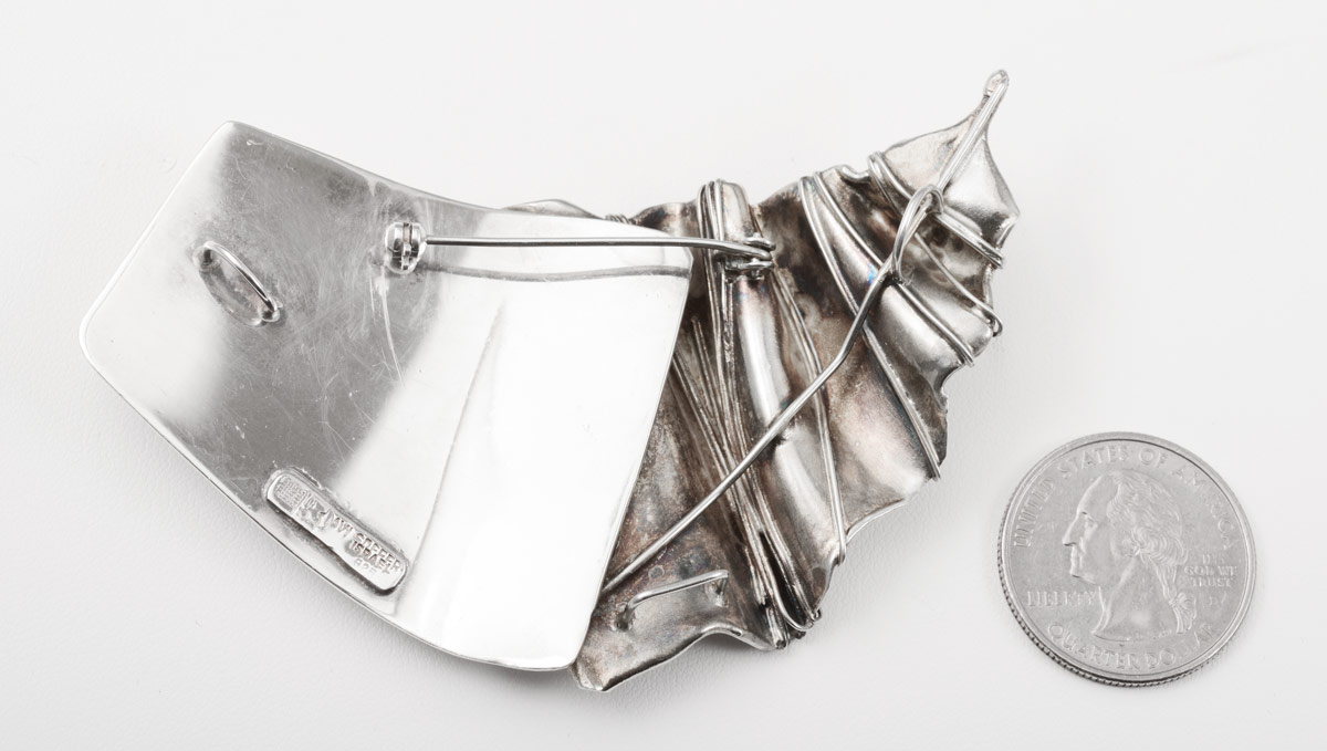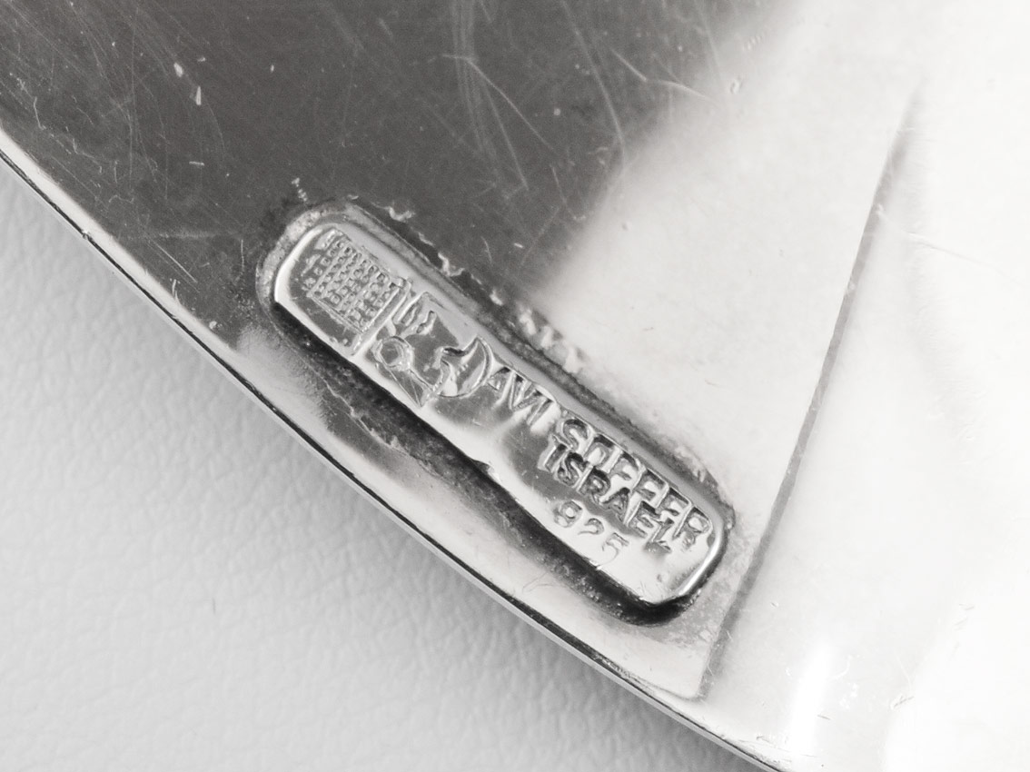AVI SOFFER STERLING BROOCH/PENDANT: Handcrafted jewelry as art. This sterling piece can be worn as a brooch or worn as a pendant and hung from different angles. Signed Avi Soffer 925 Israel. The workshop is in Tel Aviv and jewelry is sold through selected galleries throughout Israel, Europe and the US. Length 3.5'', width 1 .75''. Weight. .9 troy oz.