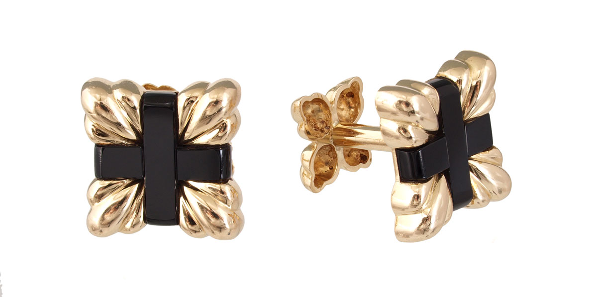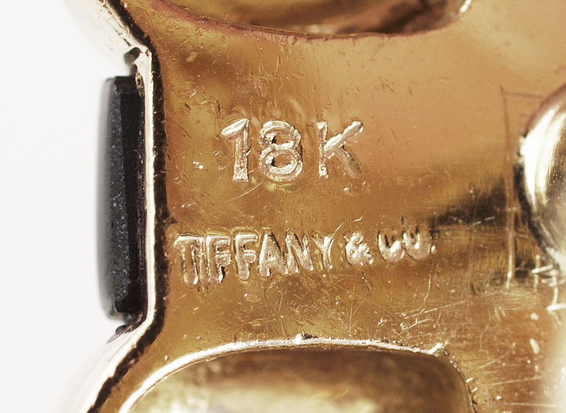 TIFFANY & CO GOLD & ONYX CUFFLINKS: 18K yellow gold cufflinks with black onyx. Signed Tiffany & Co. Weight: 20.4 grams.