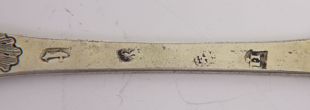 1696 ENGLISH SILVER TRIFID SPOON: Engraved foliate motif trifid end, unknown maker hallmark I.L over rosette in shield and dated 1696. 7 3/8'' l., approx. 1.5 troy oz.