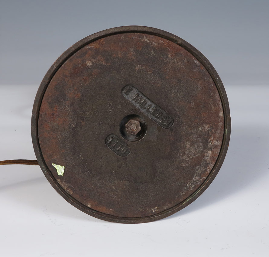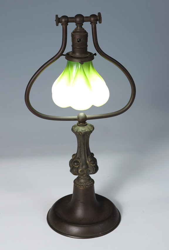 E. MILLER TULIP SHADE TABLE LAMP: Cast metal base marked E. Miller Co., 1110. Harp with central single socket. Tulip form shade. Lamp 18 3/4'' h. x 9 1/4'' x 6 1/2''. Shade 4 1/4'' h. x 5 1/4''.