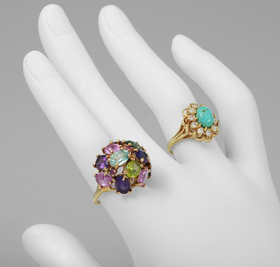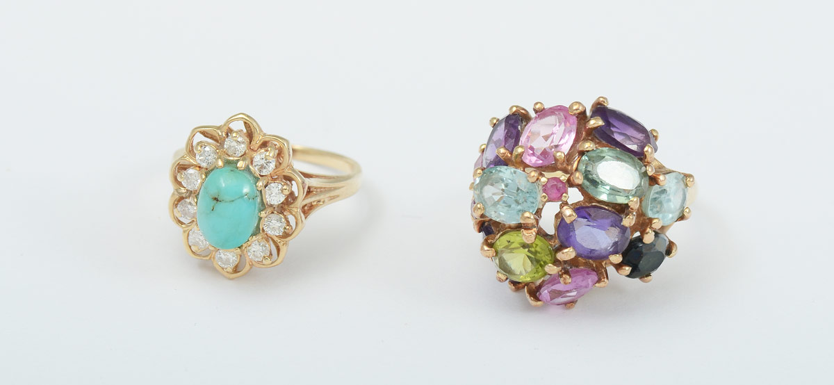 TWO 14K GOLD GEMSTONE RINGS: 1) Multi gemstones including amethyst, tourmaline and peridot totaling approx. 12.00 Ct. Size 6. 2) Turquoise framed by approx. .33 Ctw. Diamonds. Rated SI-I1 in clarity and H-I in color. Size 5. The diamonds and gemstones are prong set. Weight: 11.3 grams.