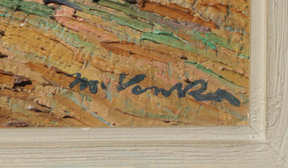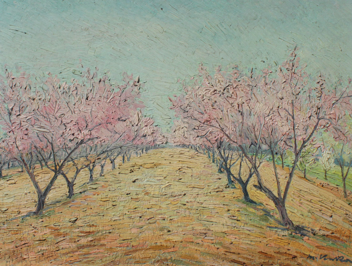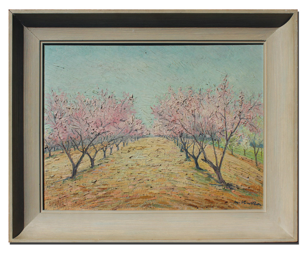 LANDSCAPE WITH BLOSSOMING PINK TREES: Oil/Canvasboard, 18'' x 24'', illegibly signed lower left, period textured and painted frame with minor wear, 24'' x 29 1/2''.