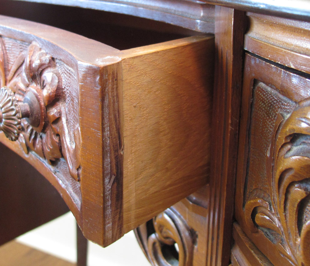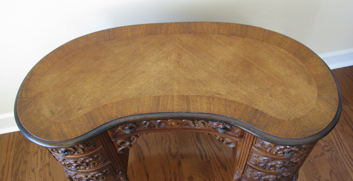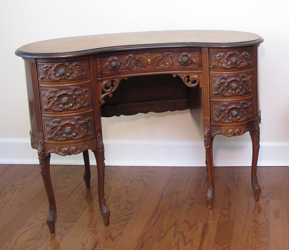 FRENCH CARVED KIDNEY SHAPE VANITY: Shaped top with carved drawer fronts and applied decoration. Carved and shaped legs. 30 1/2'' h. x 41 1/2'' x 20''.