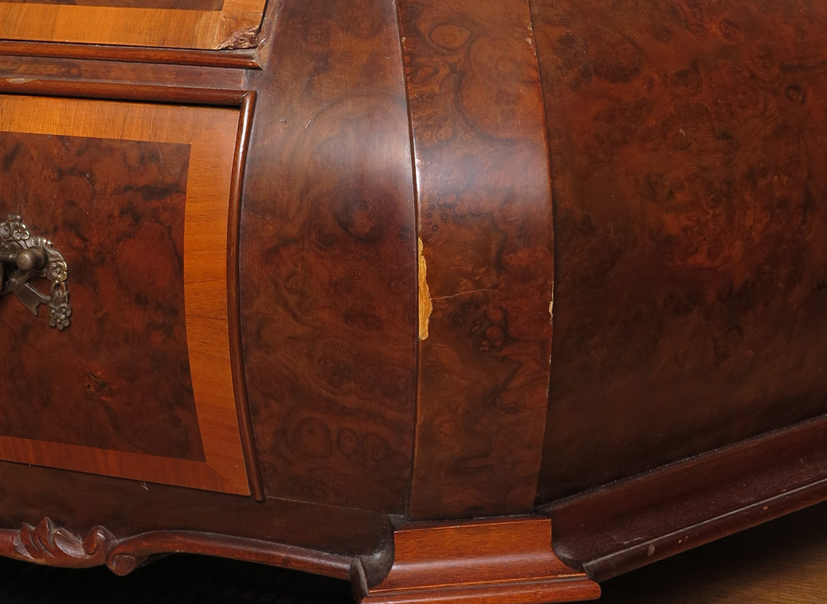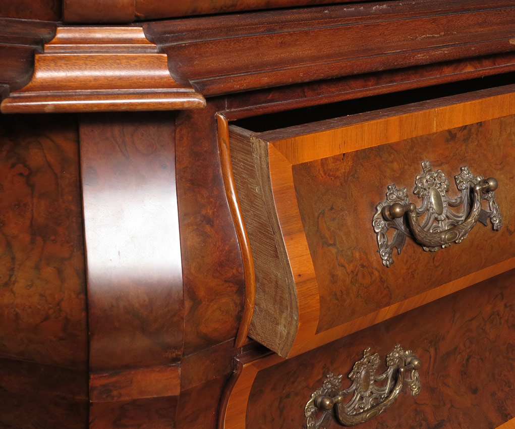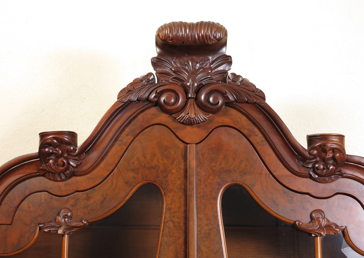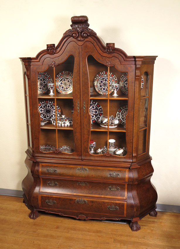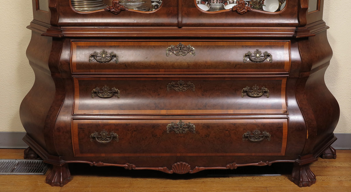 BOMBAY BURL CHINA CABINET: Burl veneer, carved crest over 2 shaped glass front doors with 2 interior shelves. Base with 3 drawers, ormolu mounts & handles. All on claw and ball feet. Key in office. Overall 90'' h. x 70'' x 16 1/2''.