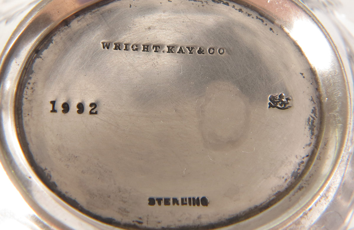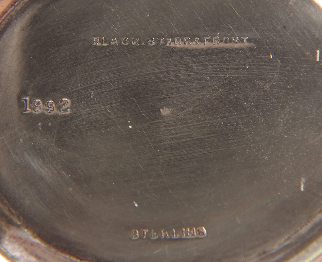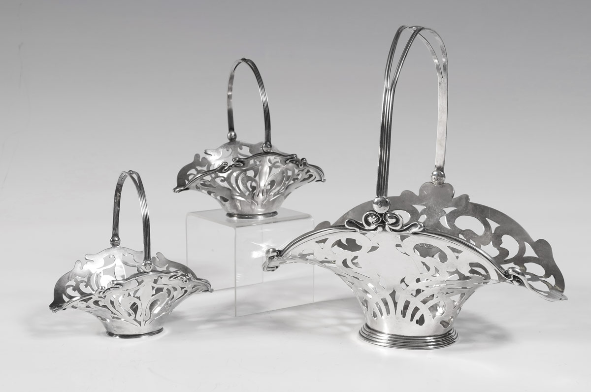 3 ART NOUVEAU STERLING BASKETS: 3 pieces to include 1) Unger Brothers with articulated handle, monogrammed. 4 3/4'' h. x 9 1/2'' x 5 1/2''. 2) Pair identical smaller baskets, one retailed by Wright Kay & Co., the other Black, Starr & Frost. 2 5/8'' h. x 5 1/8'' x 3 3/4''. Approx. 14.9 troy oz.