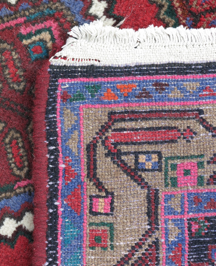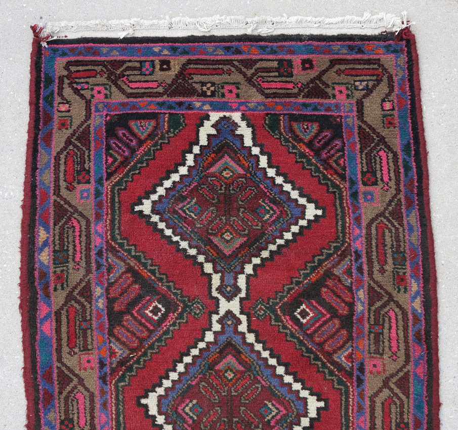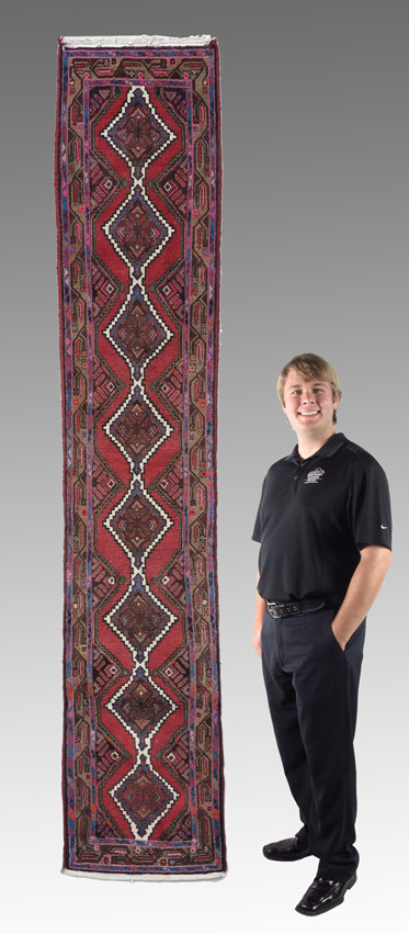 MODERN PERSIAN SERAB DESIGN HAND KNOTTED WOOL RUG, 2' 5 1/2'' x 10' 1'': This runner has a central design of attached diamond shaped stepped edge medallions on a tomato red field. The medallions are outlined in white and black for a very dramatic visual effect. The rest of the rug's colors, the reds, blues, pink, orange, and beige seem subdued by contrast. The beige ground main border has a typical Serab design of vines connecting botehs (or paisleys). Condition is good.