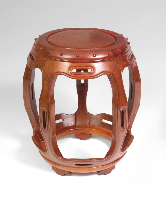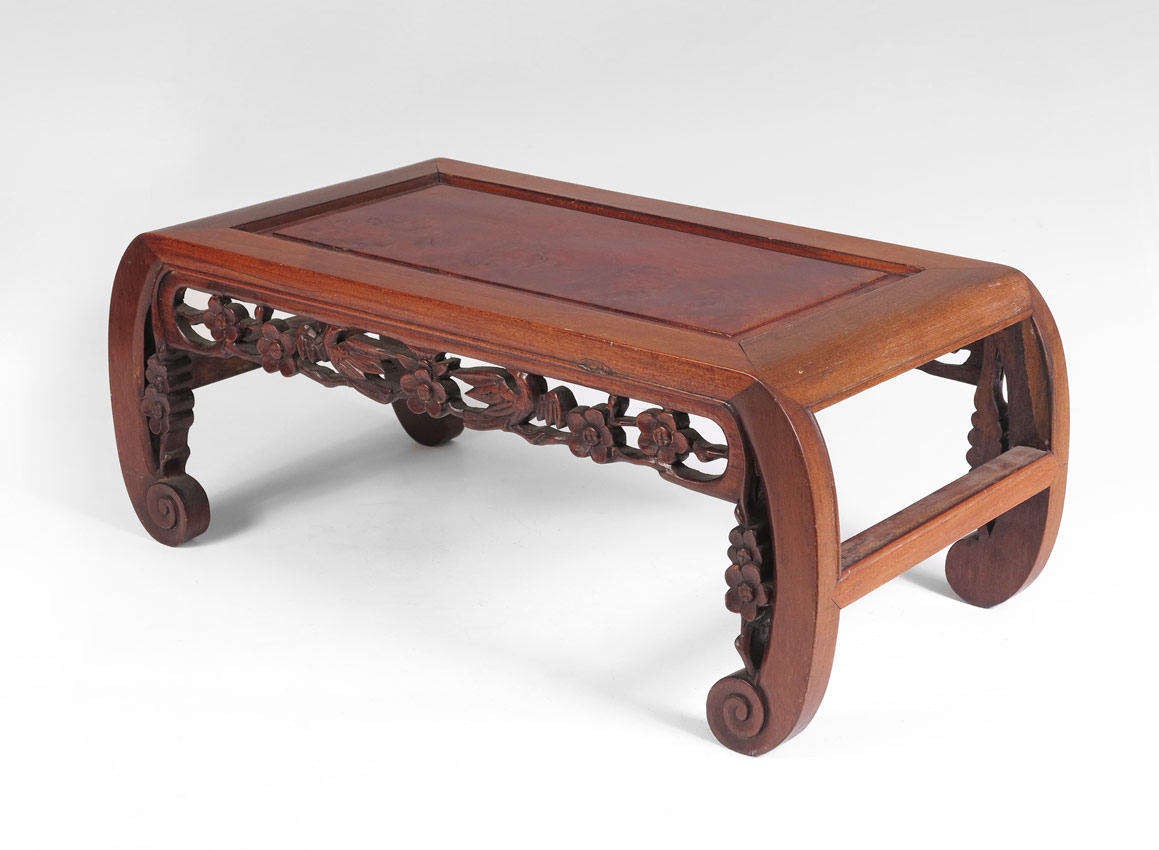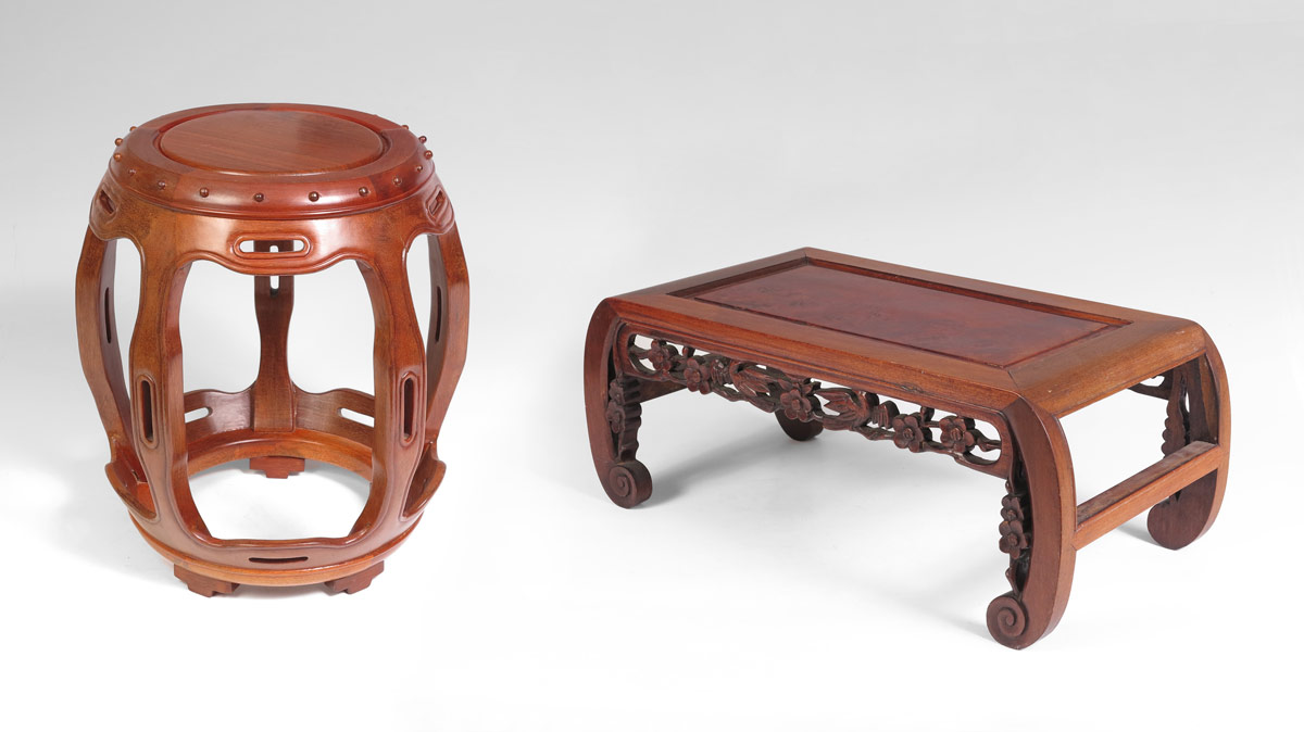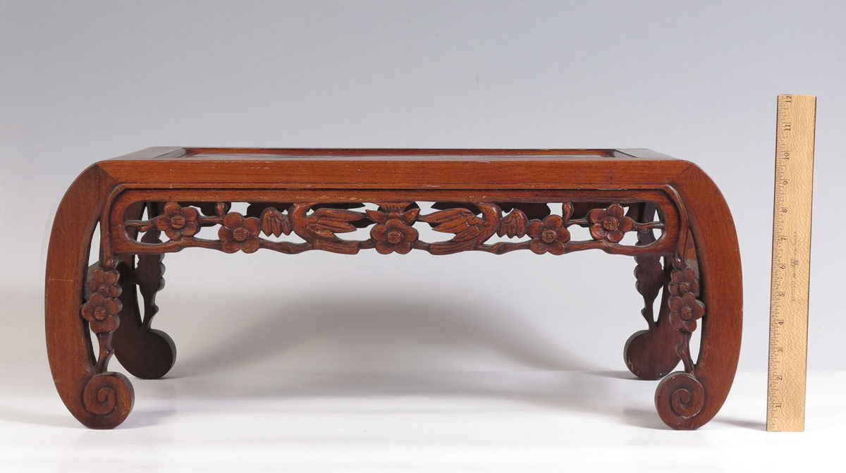CARVED ASIAN STOOL AND DIMINUTIVE TABLE: To include 1) Diminutive alter table with carved skirt, 9 3/4'' h. x 25'' x 12 3/4''. 2) Stool or plant stand, 18 1/4'' h. x 16'' dia.