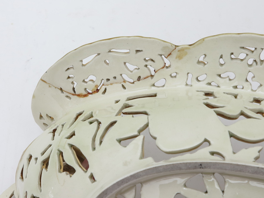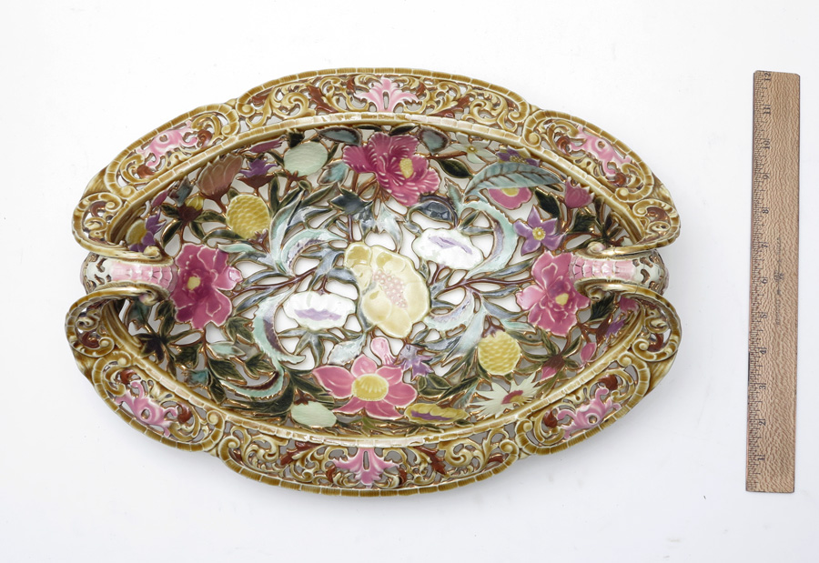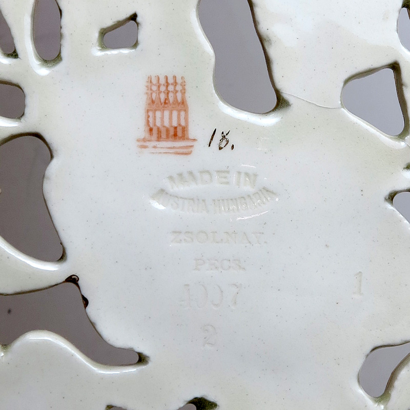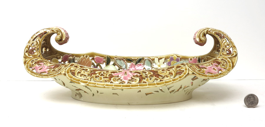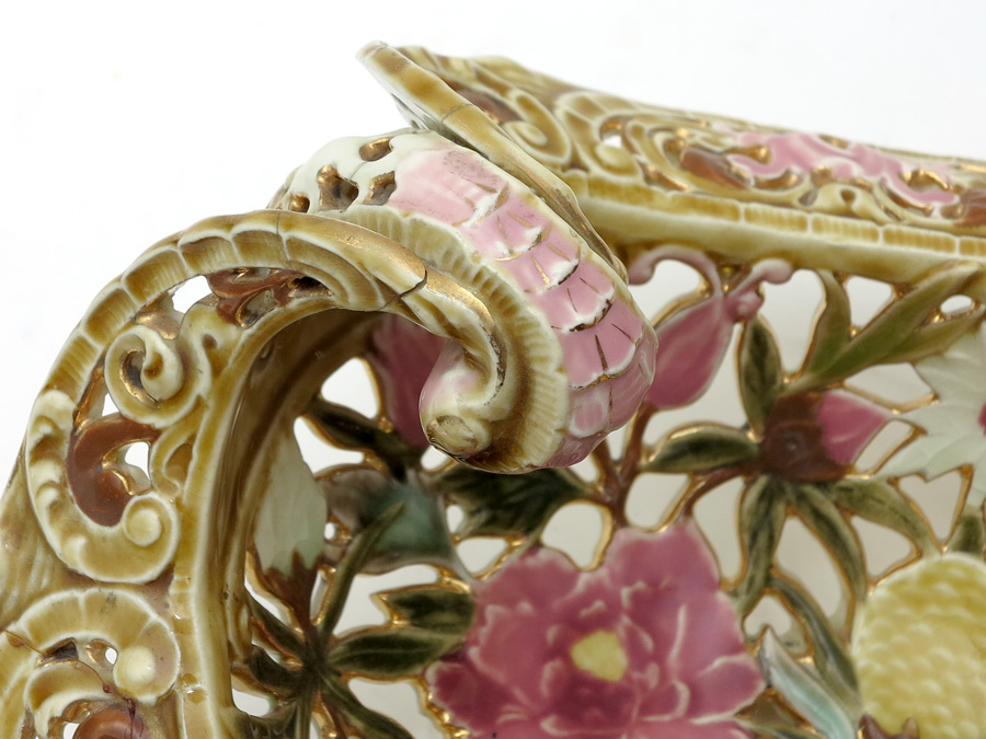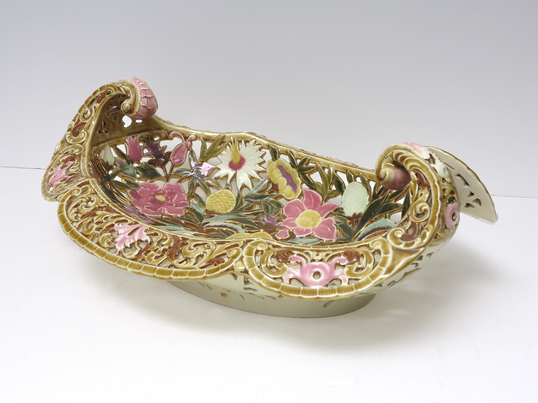 SZOLNAY AUSTRIAN HUNGARIAN RETICULATED CENTER BOWL: Earthenware in a pierced floral and leaf design, scrolled ends, parcel gilt, faience glaze. Ca. 1891-1895 indicated by the incised number 4007. Marked with red mark, also impressed Made in Austria Hungary Zsolnay Pecs 4007 2. Measures approx. 5 1/2'' tall x 15 1/2'' x 11 3/4''.