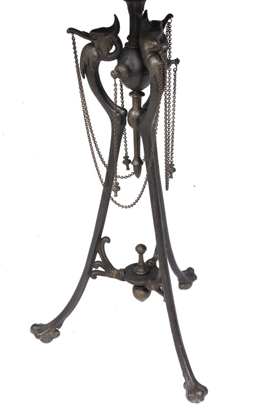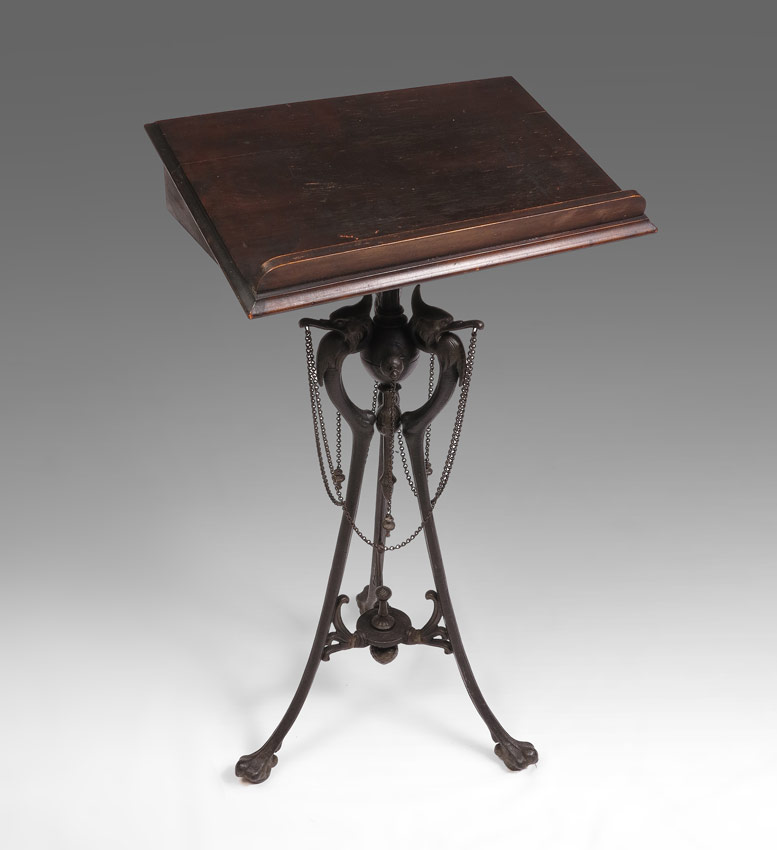 FIGURAL AESTHETIC MOVEMENT DICTIONARY STAND: Cast metal tri foot base with figural cranes ending in paw feet. Wood top appears to be a marriage. Overall measures 38'' h. x 17'' x 20''.