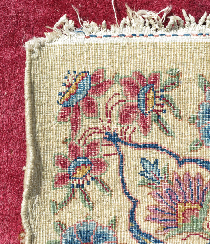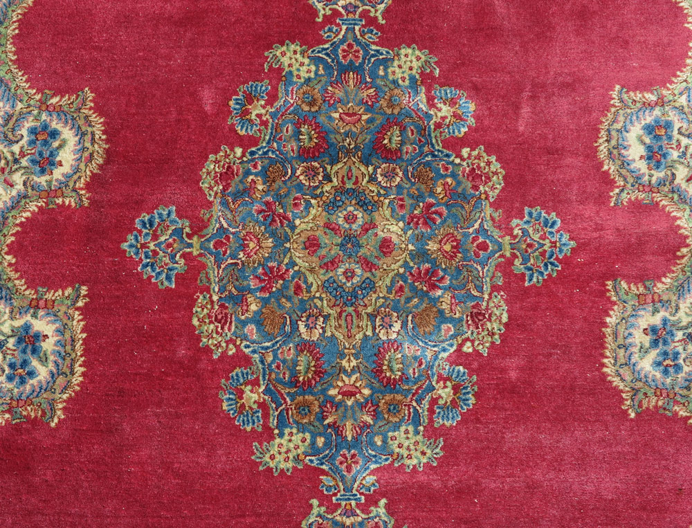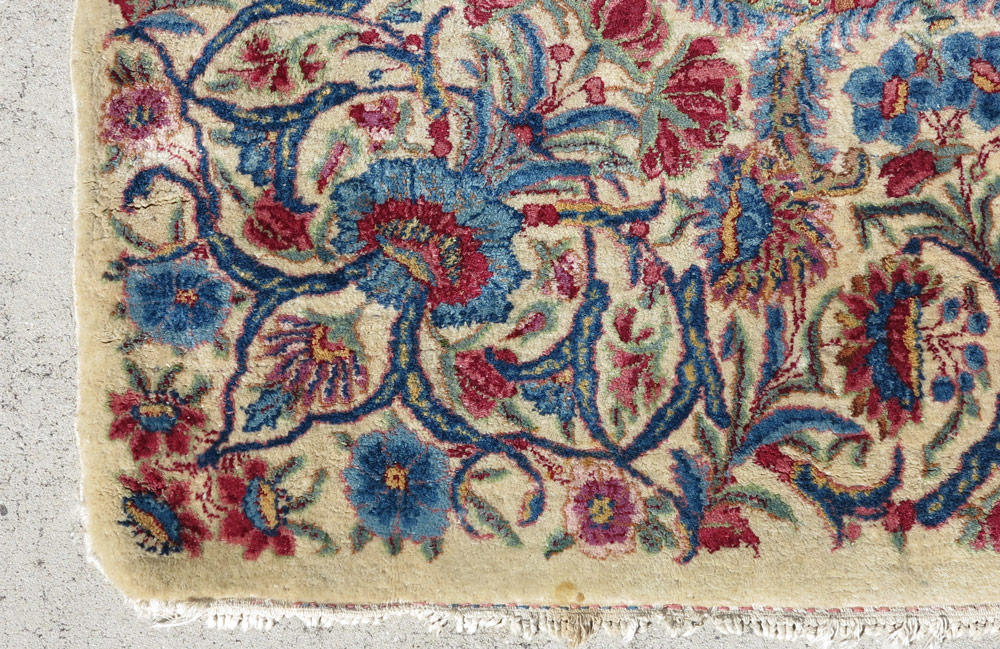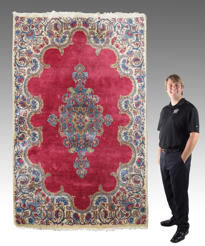 SEMI-ANTIQUE PERSIAN KERMAN HAND KNOTTED WOOL RUG, 6' x 9': The pretty deep rose color of this field has a central medallion of mostly blue and white flowers. The open field is bordered by a deeply scalloped edge in the same colors as the medallion. The ivory color of the border with the blues, pale green, beige, and brown floral motifs make an interesting contrast to the central field. Condition is good.