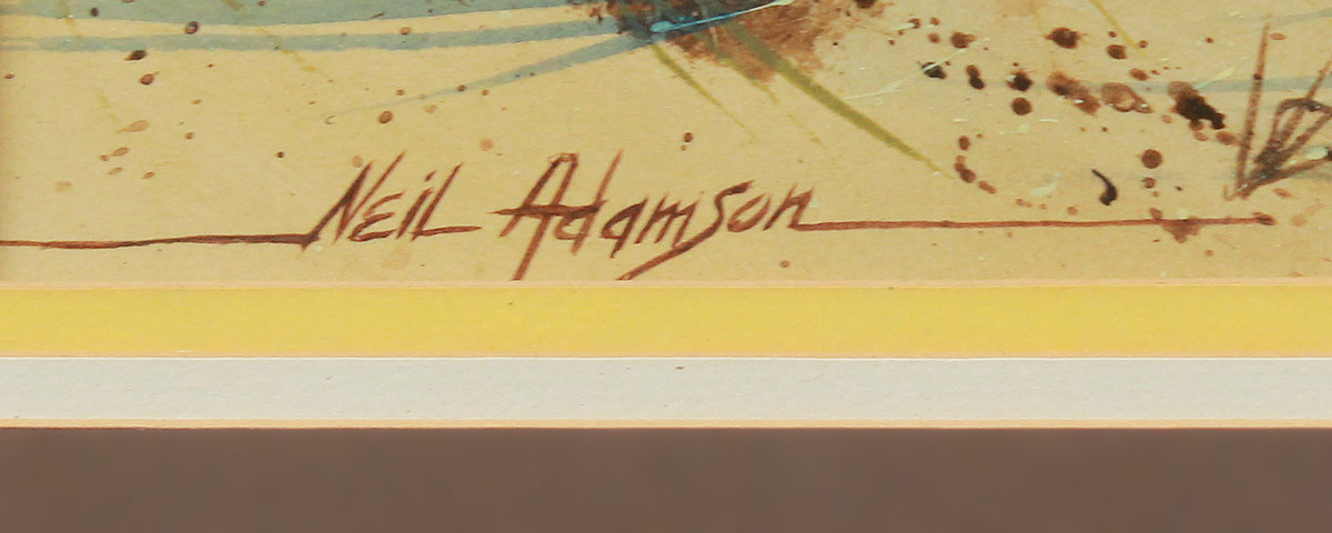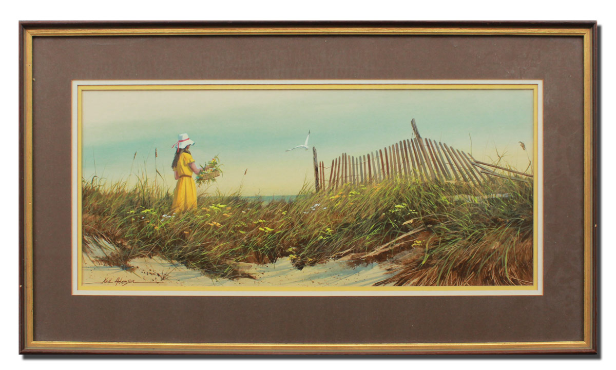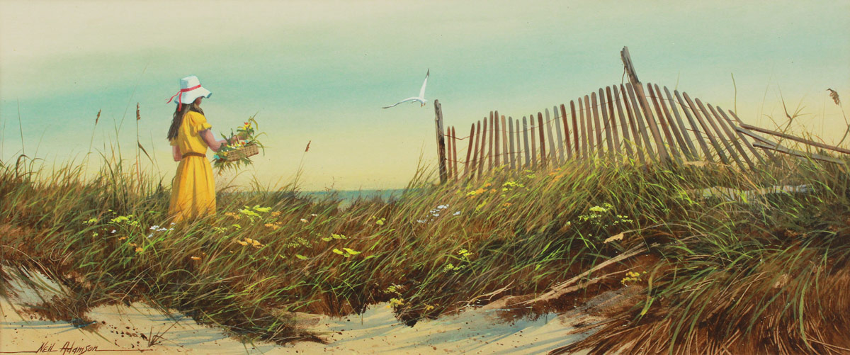 ADAMSON, Neil, (American, 20th C.): Christine on The Beach, Acrylic, Sight size, 10 1/2'' x 25 1/2'', signed lower left, framed 18 1/4'' x 33'', The Young girl holding the Flower Basket is Adamson's daughter, Christine, verified by the Artist.