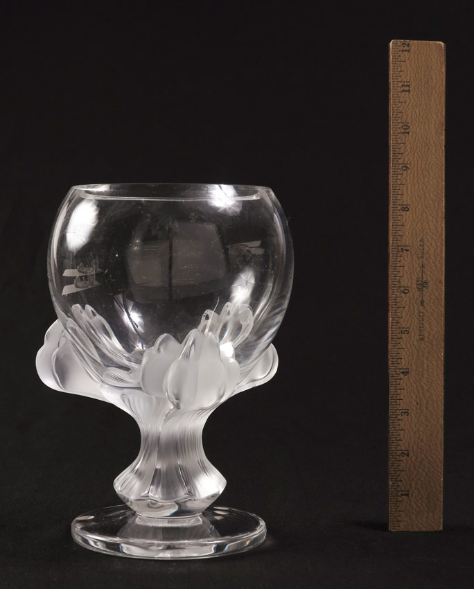 LALIQUE FRENCH CRYSTAL ''BAGHEERA'' LION PAW VASE: Frosted paws under the clear bowl vase, signed in script. Approx. 8 1/2'' tall, the base 6'' dia.