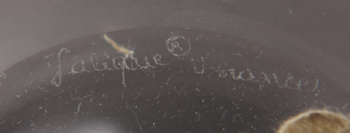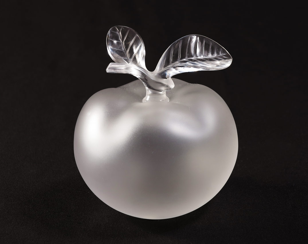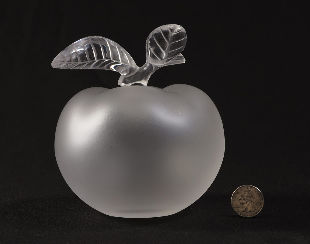 LALIQUE FRENCH CRYSTAL APPLE FORM PERFUME BOTTLE: Frosted apple with leaf form clear glass stopper. Measures 5 1/2''h. x 5'' dia. Signed Lalique France R in a circle.