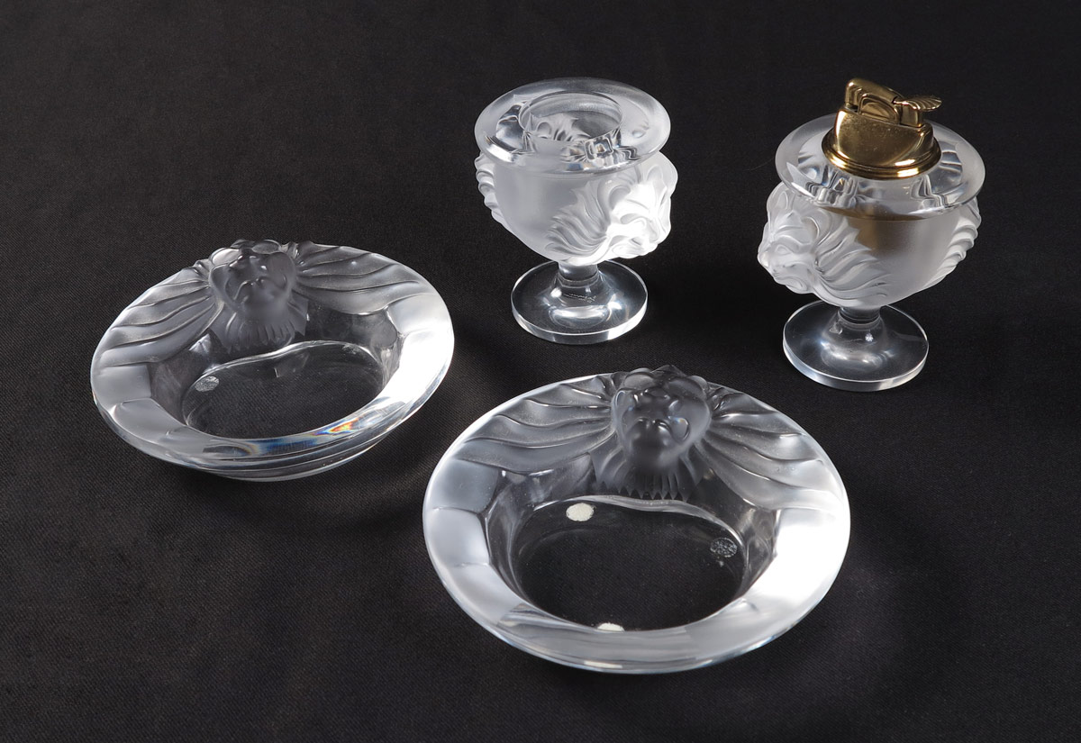 LALIQUE LION HEAD TABLETOP SMOKING ITEMS: 4 pieces total to include 2 lions head ashtrays (2 1/4'' h. x 5 3/4''), lighter (5'' h.) and cigarette vase (3 7/8'' h.).