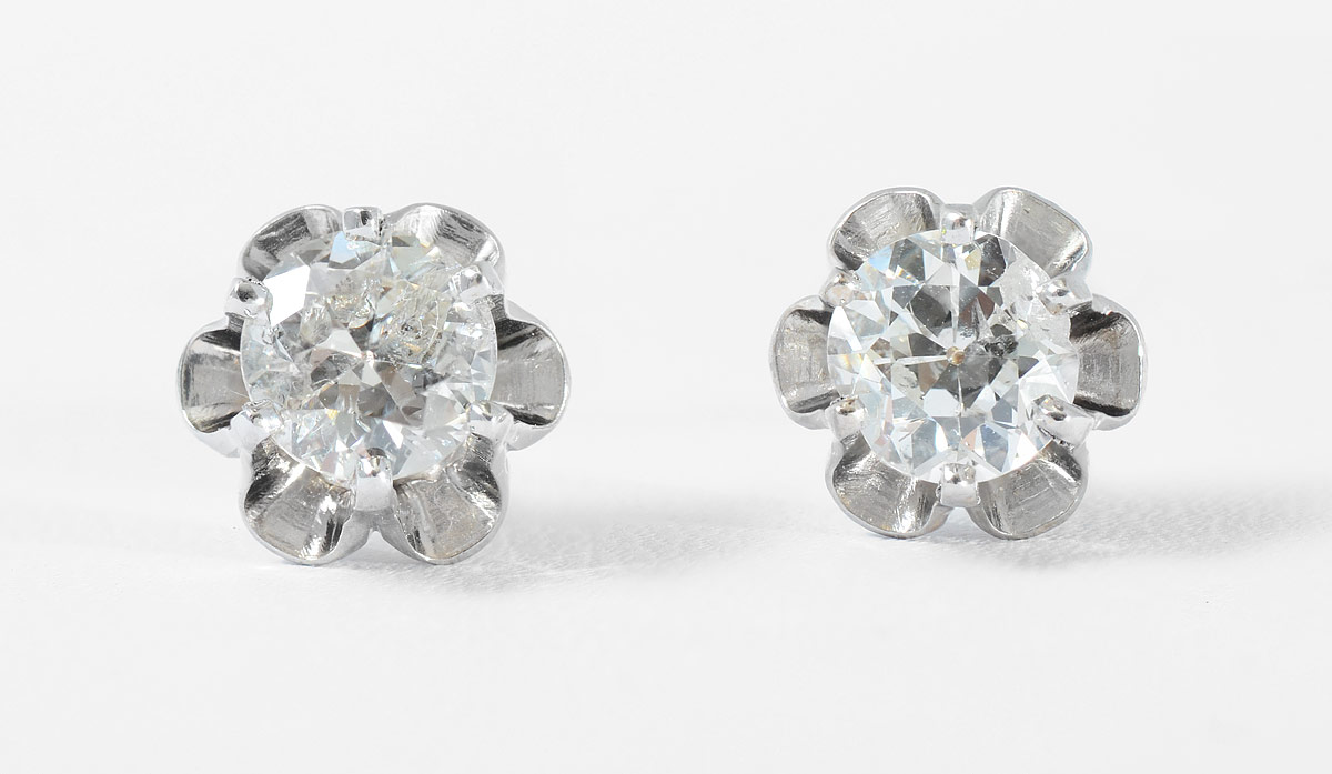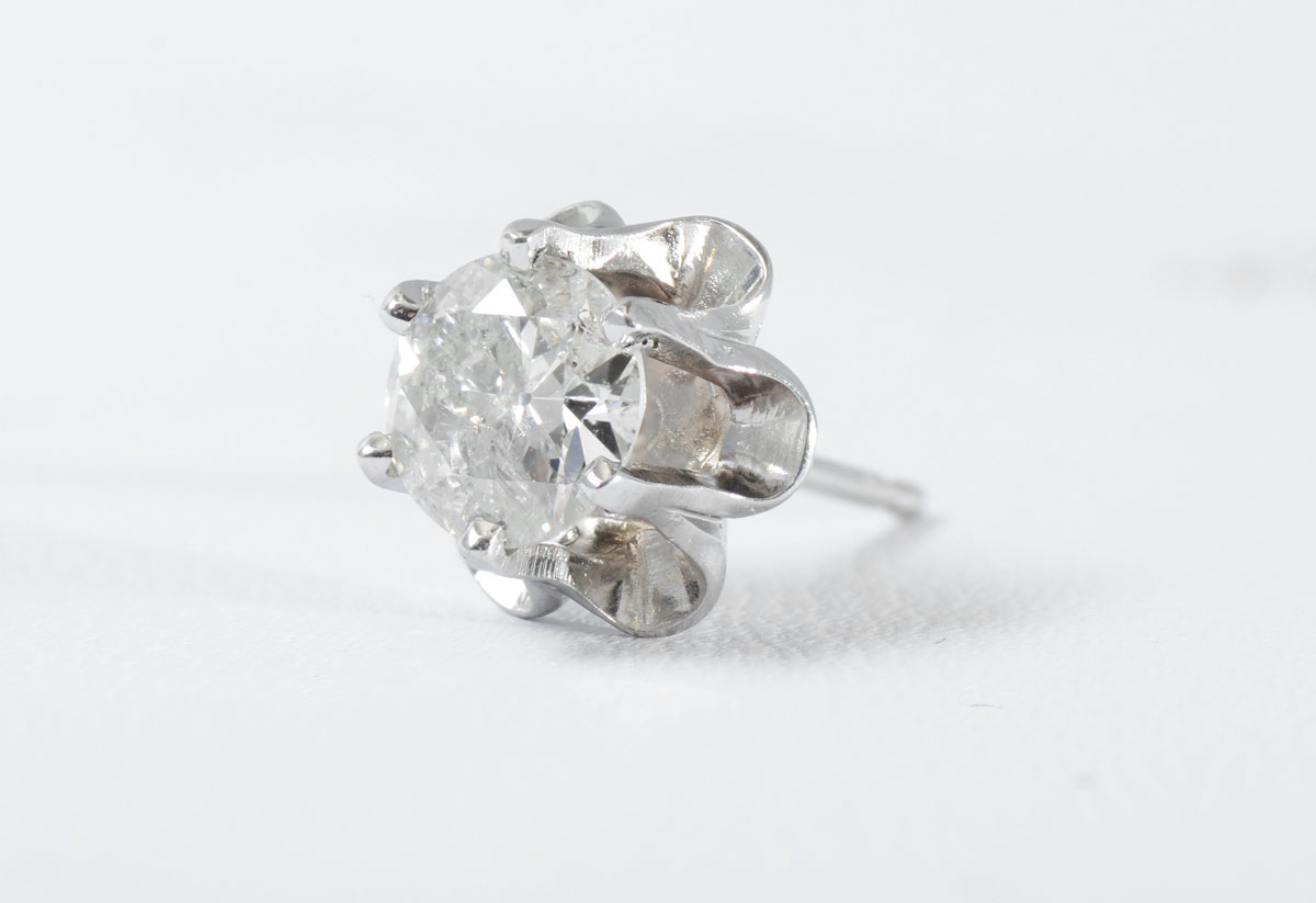 1.21 CT DIAMOND BUTTERCUP STUD EARRINGS: 14k white gold diamond stud earrings of 2 old European round cut diamonds totaling approx, 1.21 Ct., averaging I1 in clarity and H-I color. Diamonds are prong set, post and nut closures. Weight 1.9 grams. Sold with current Atlanta Gemological GIA graduates appraisal for $3,150.