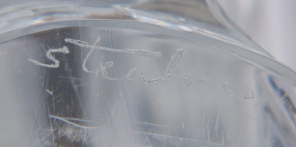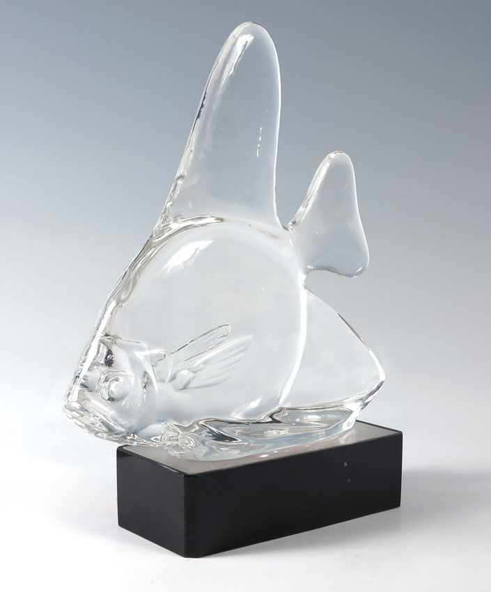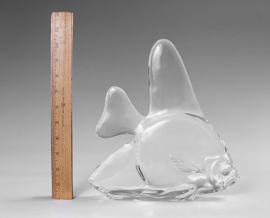 STEUBEN CLEAR CRYSTAL FISH: Signed on base, 10 3/8'' h. x 10''. Sold with the lighted base, 2'' h. x 7'' x 3 1/4''.