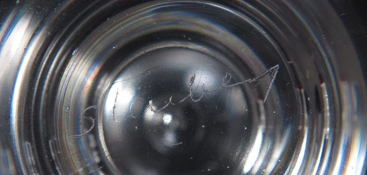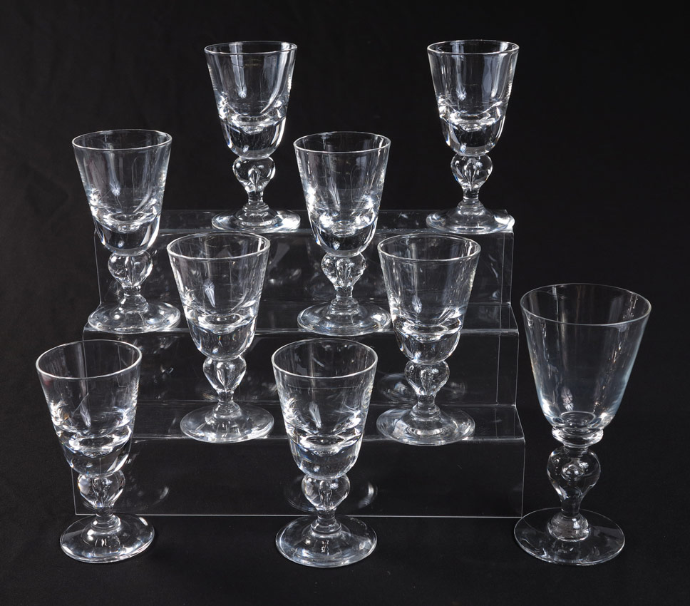 SET OF 8 STEUBEN CRYSTAL STEMS: Each 6 3/4'' tall. Sold together with a larger 8 1/2'' goblet. Signed.