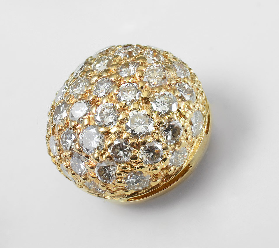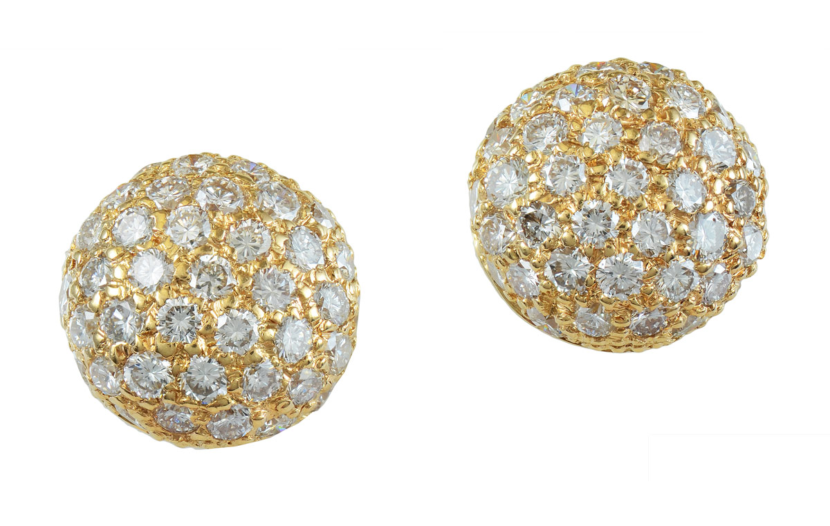 18KT DIAMOND DOME EARRINGS: 18K yellow gold domes pave set with 72 round brilliant diamonds totaling approx. 1.50 Ct. The diamonds average VS in clarity and G-H color. Post and nut closure, Weight 3.5 grams. Sold with current Atlanta Gemological GIA graduates appraisal for $3,500.