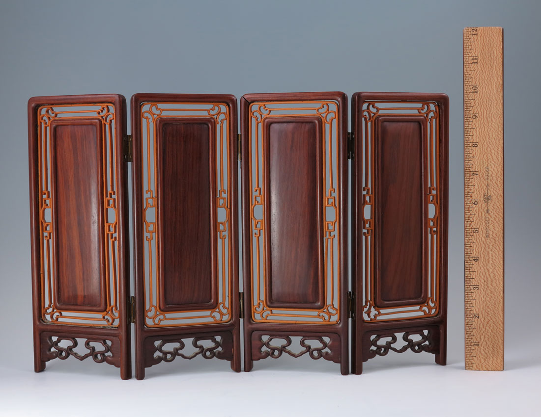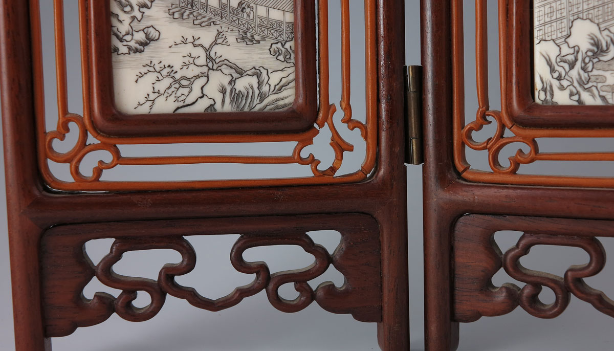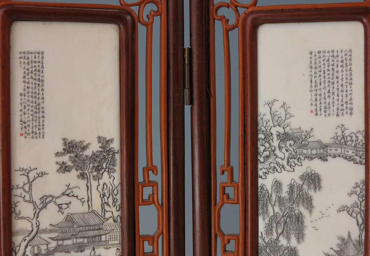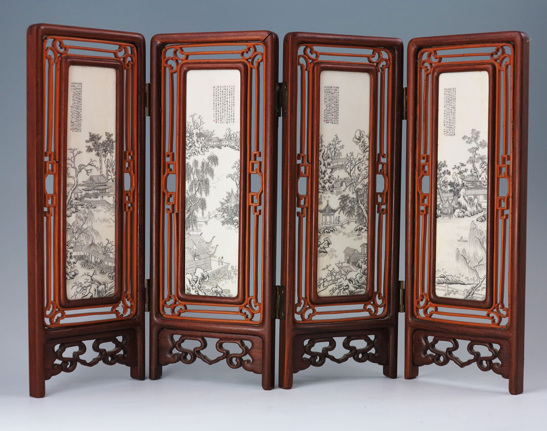 CHINESE SCRIMSHAW IVORY TABLE SCREEN: 4 panel screen with ivory panels with outdoor genre scenes and writing, framed in carved light wood, with outer rosewood stands. Each panel 10'' h. x 3 3/4''.