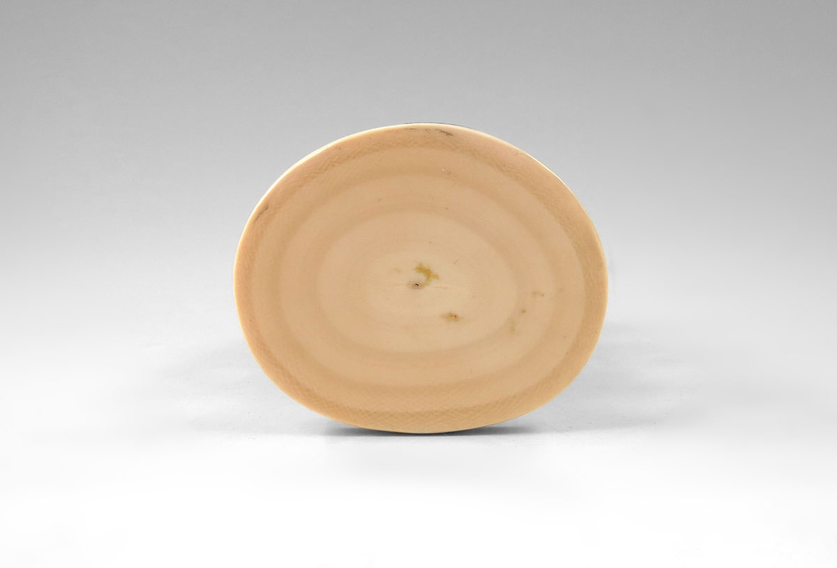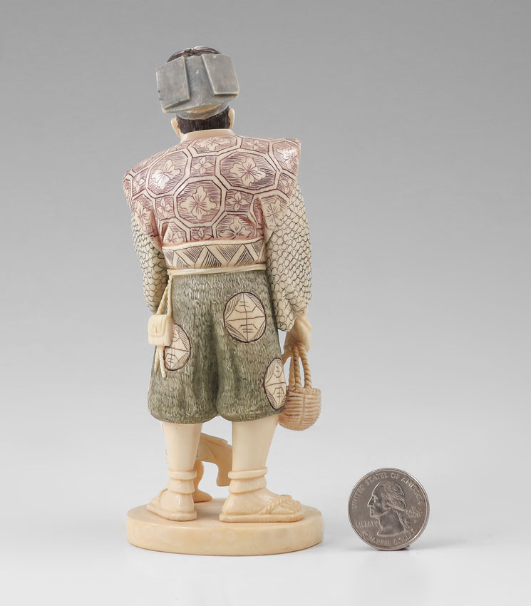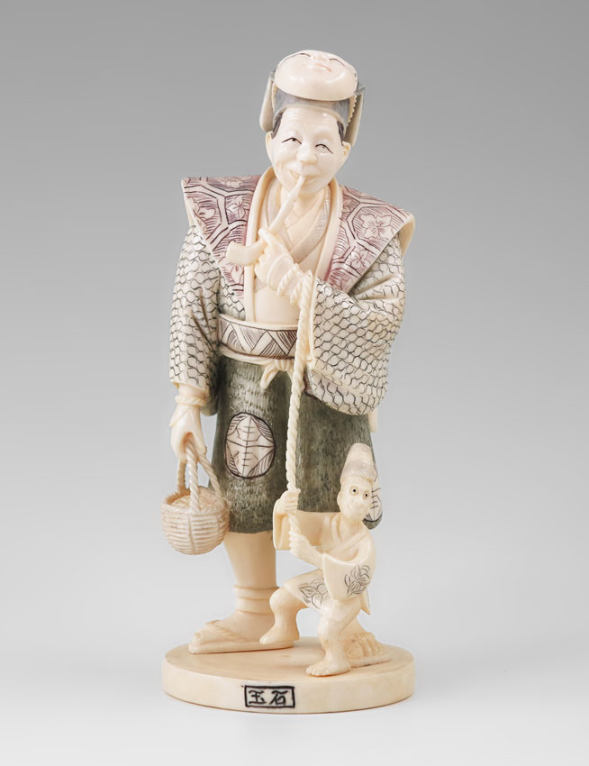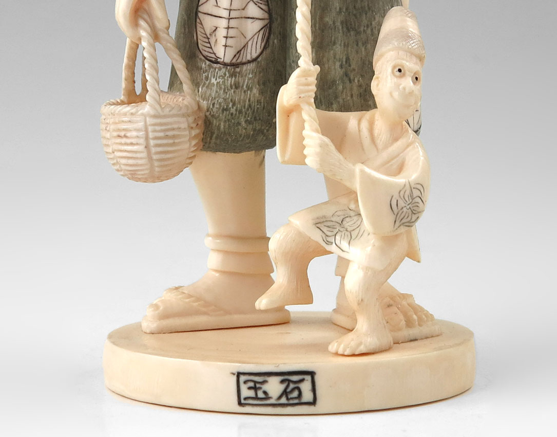 CARVED IVORY FIGURE OF AN ACTOR: Carved figure of and actor smoking a pipe, mask on head, holding a basket and with a monkey at his feet. Signed front of base. 5 7/8'' h.