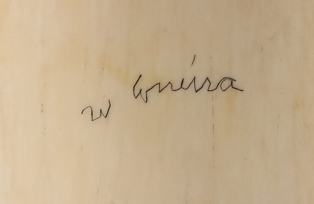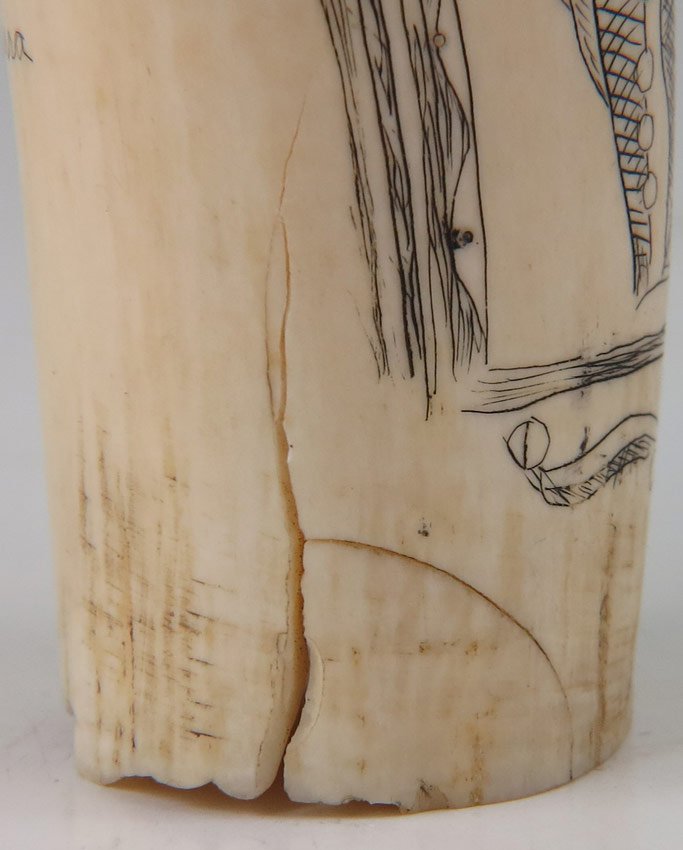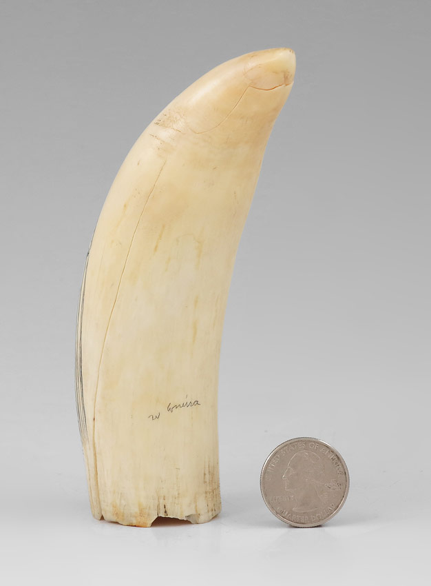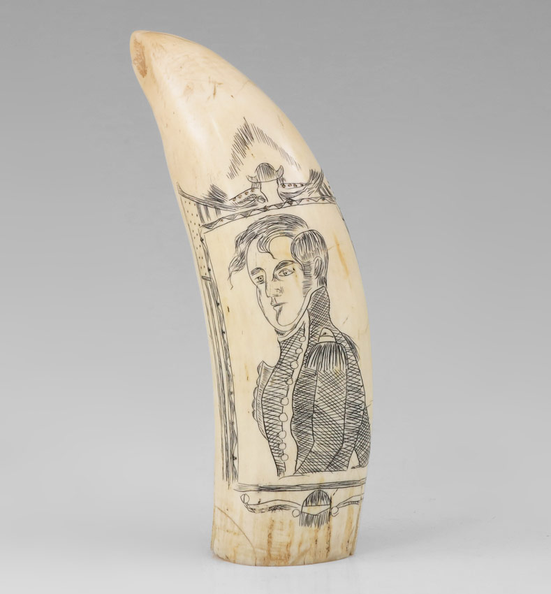 COMMODORE PERRY SCRIMSHAW WHALES TOOTH: Whales tooth featuring portrait of Commander Oliver Perry in a frame, signed W. Guerra. Age unknown. 5 3/8'' l. overall.