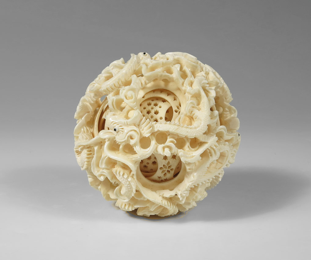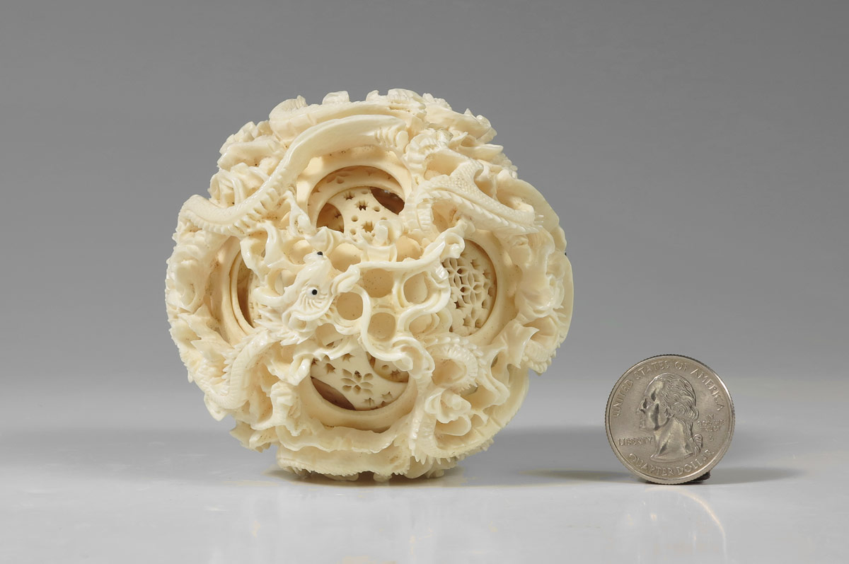 CARVED IVORY MYSTERY BALL: Carved dragon exterior, at least 8 internal spheres. Overall 3'' dia.