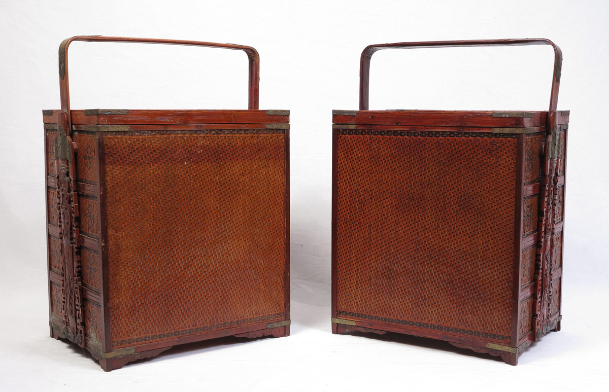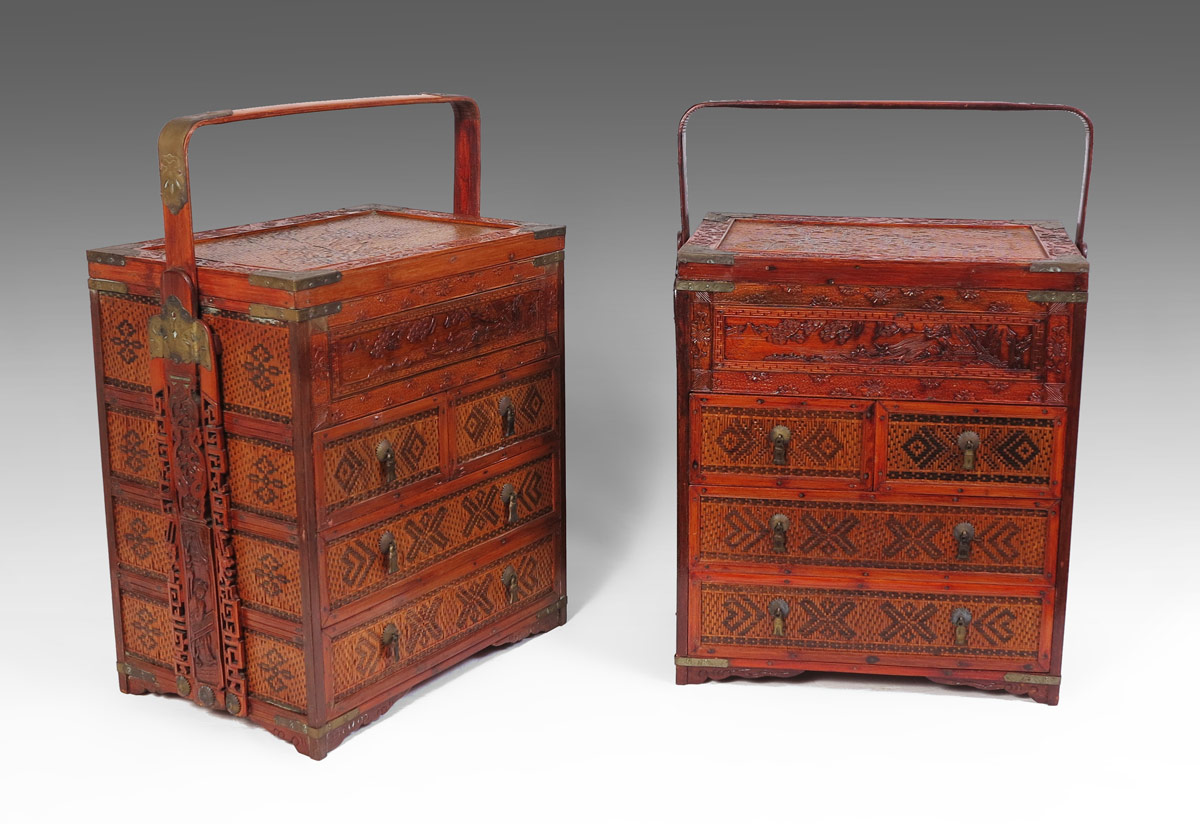 PAIR ORIENTAL TRAVELLING CHESTS: Carved frames with woven designs. Each chest with removable top, 2 half drawers over 2 full length drawers. 18 1/2'' h. x 17 1/4'' x 12''.