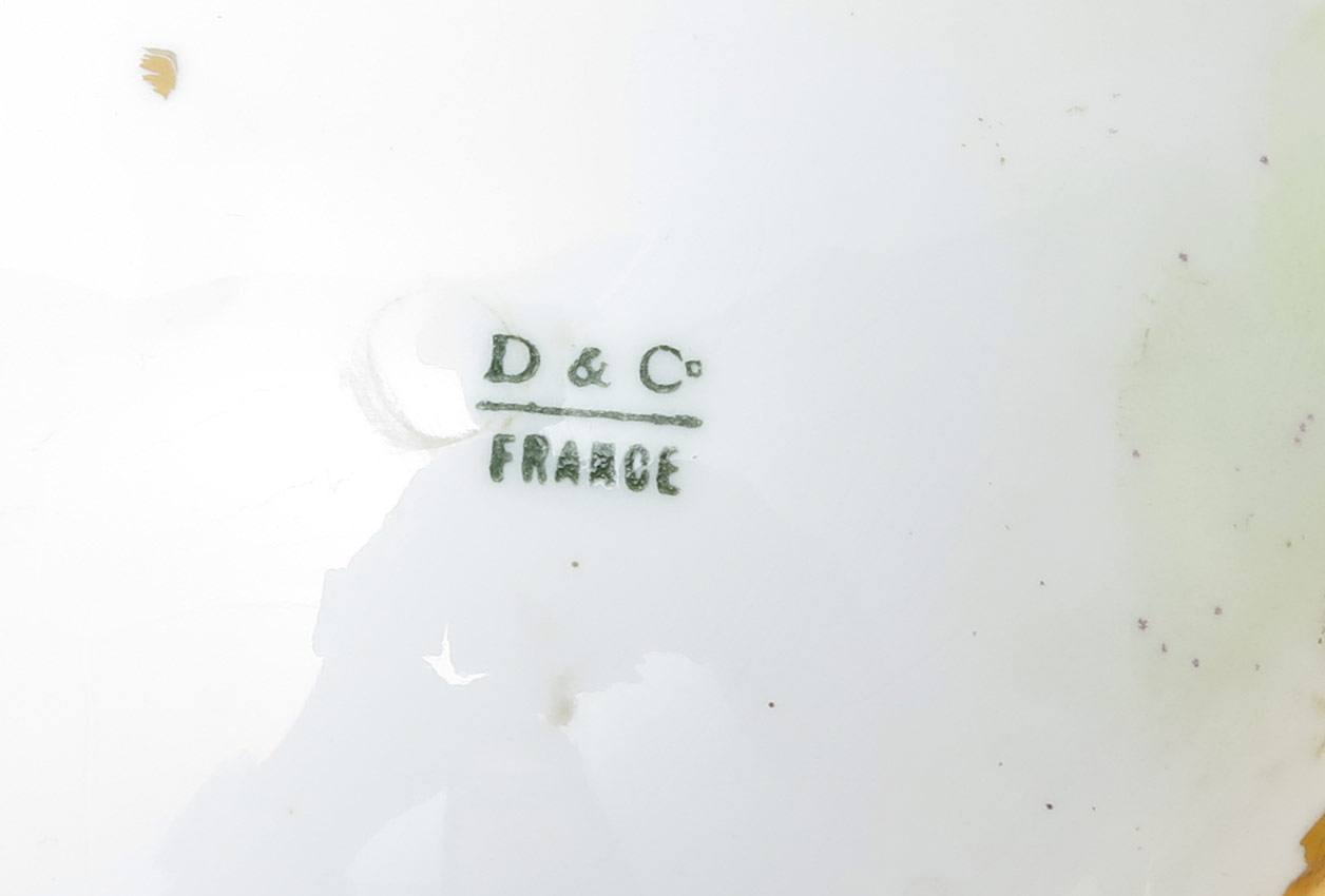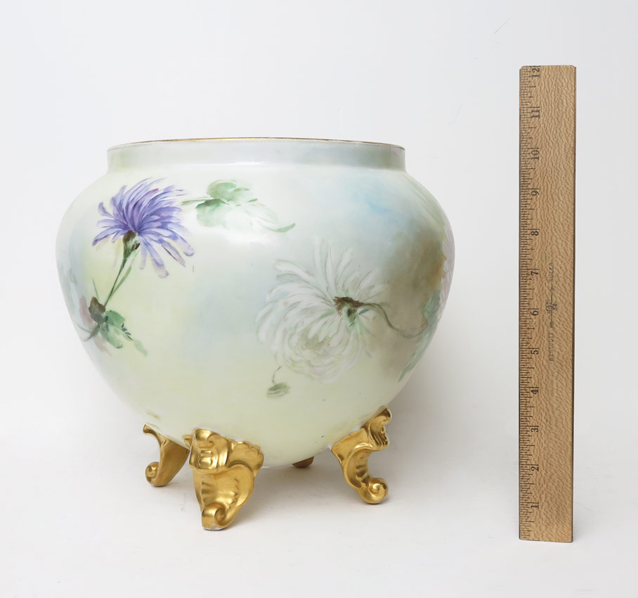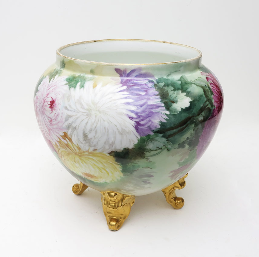 DELINIERES FRENCH LIMOGES PORCELAIN JARDINIERE: Ca. 1894-1900. Hand painted aster flowers, ornate gilt and scrolled feet. Approx. 11'' x 11 1/2'' dia. overall.