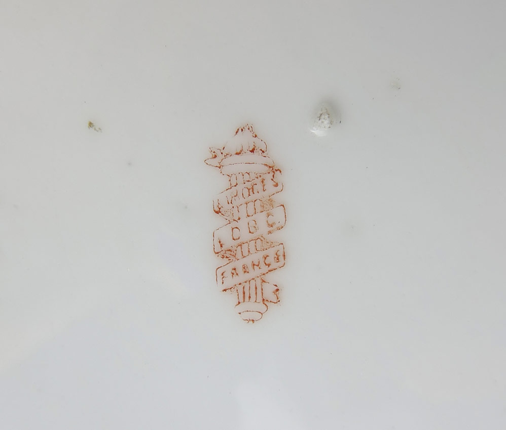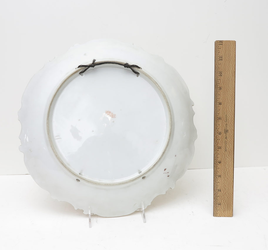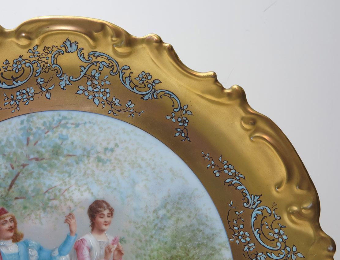 FRENCH LIMOGES CABINET PLATE: Flambeau China, Ca. 1890's. Ornate wide gold border with blue enameling, at the center is a paint enhanced image of a courting couple. Measures 13'' dia.