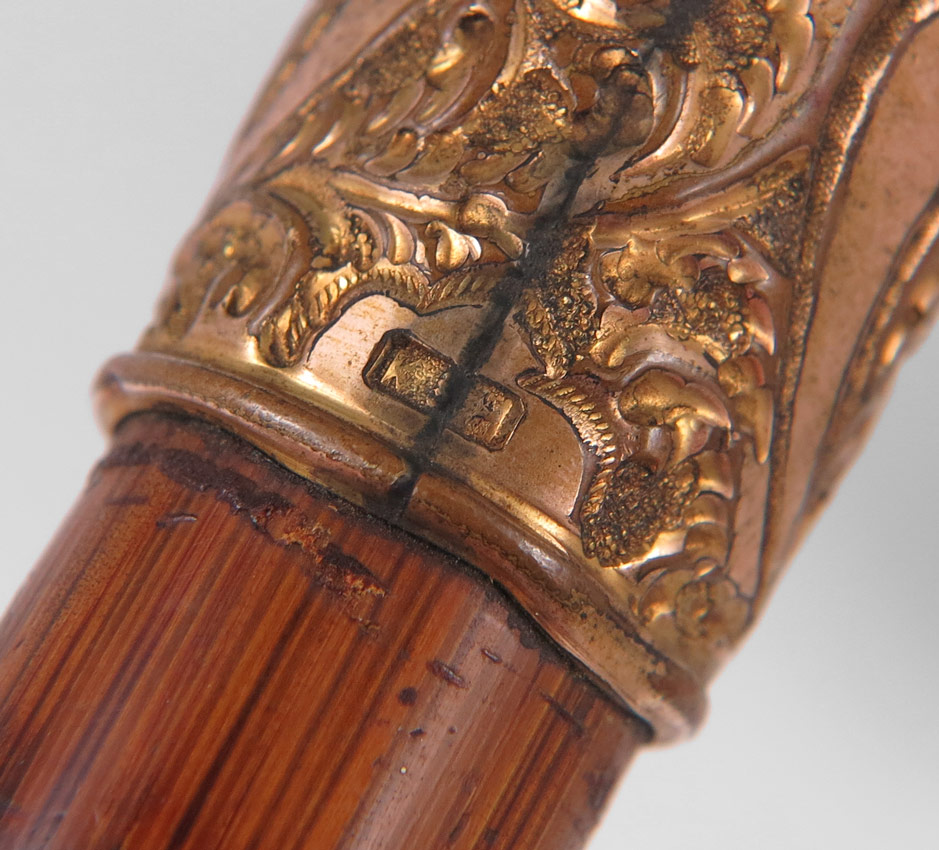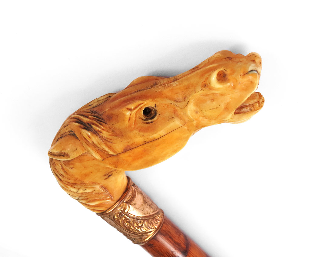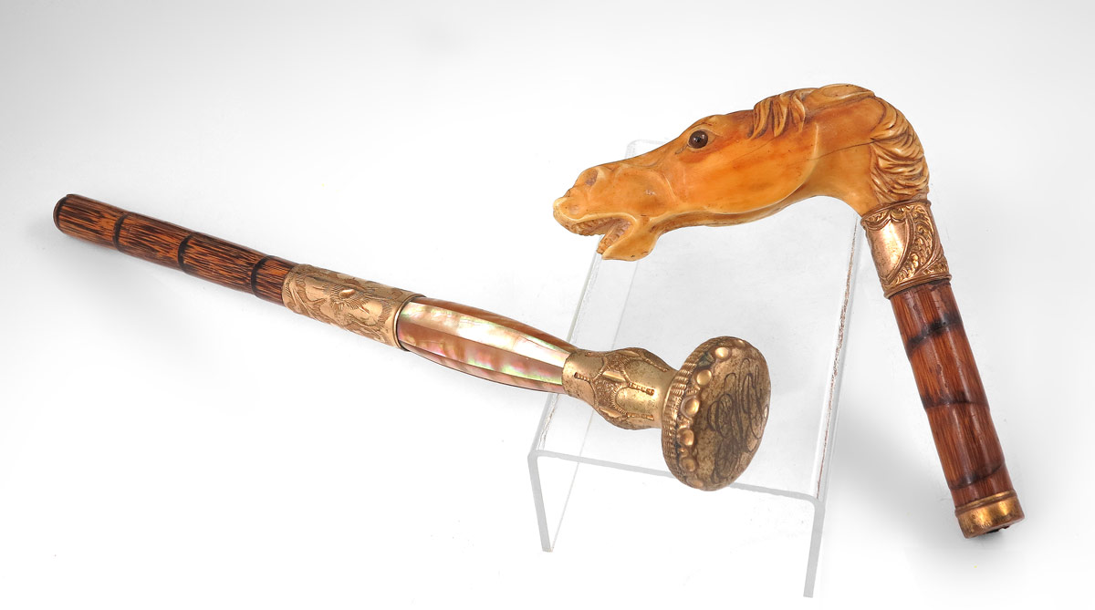 2 WALKING STICK HANDLES: 2 pieces to include 1) Carved ivory horse head pommel, gold filled collar stamped K & H, top of bamboo shaft. 5 1/2'' h. x 4 1/2''. 2) Gold filled monogrammed pommel, mother of pearl handle, gold filled collar. Top of bamboo shaft. 11 1/4''.