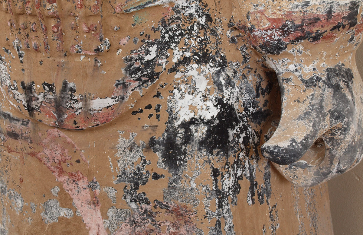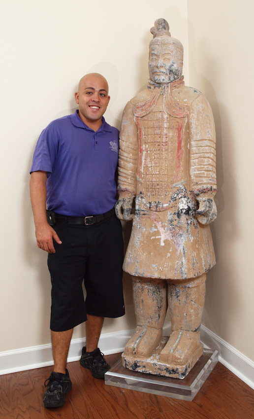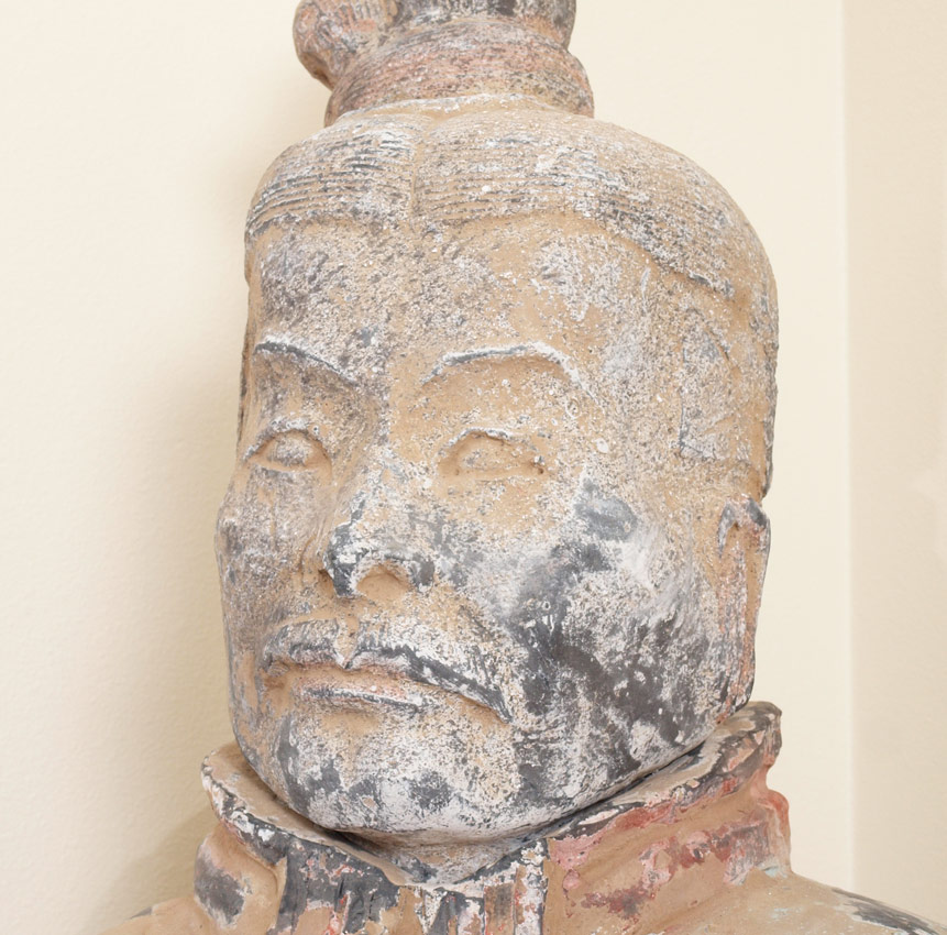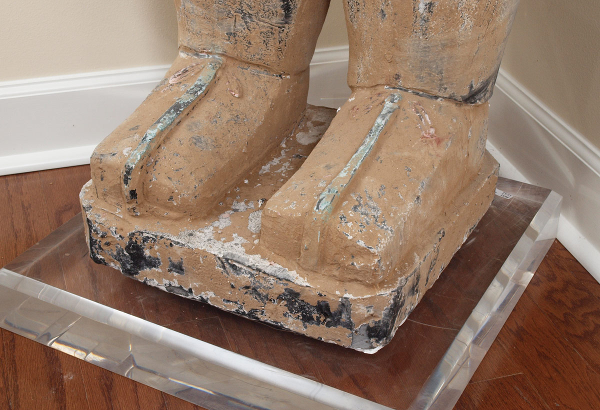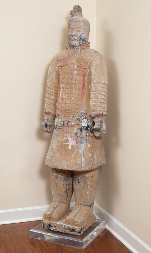 LIFE SIZE TERRACOTTA TEMPLE GUARD: A life size figure of a Chinese temple guard with removable head. Measures approx. 75'' h. x 22'' x 21''. Sold with Lucite base 3'' x 20'' square. Actual age unknown.