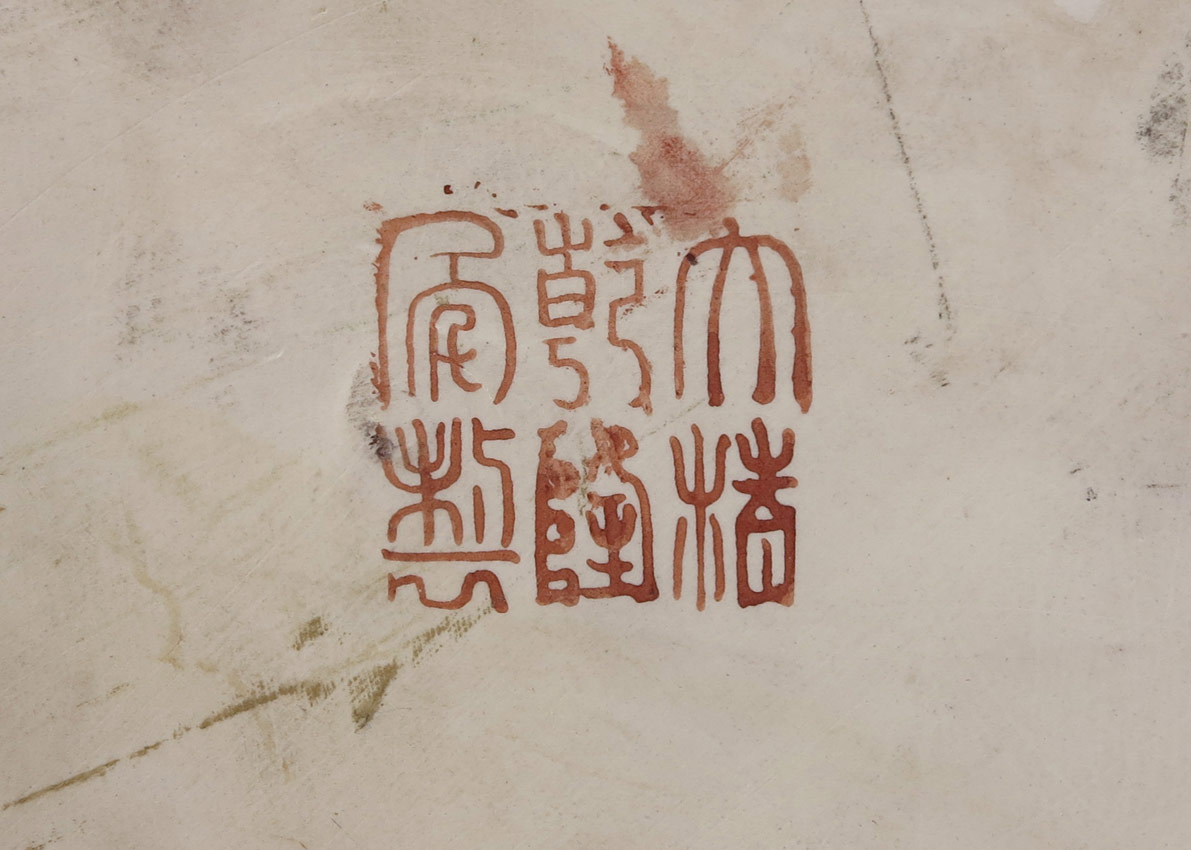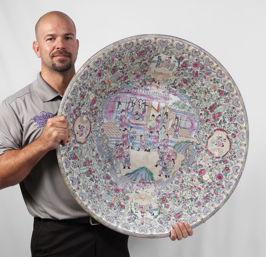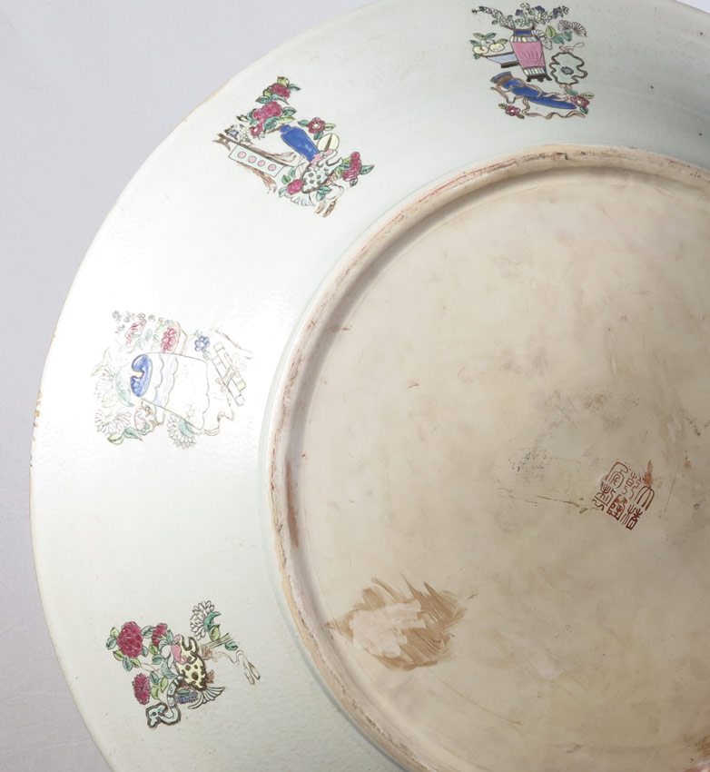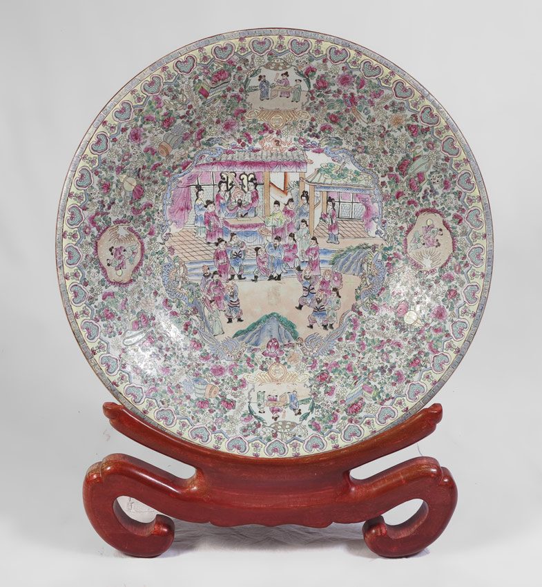 LARGE CHINESE ROSE FAMILLE CHARGER: Centering a scene of celebration. Signed in characters. Sold with the wood stand. Measures approx. 30 1/2'' dia., depth is 4 1/2''.