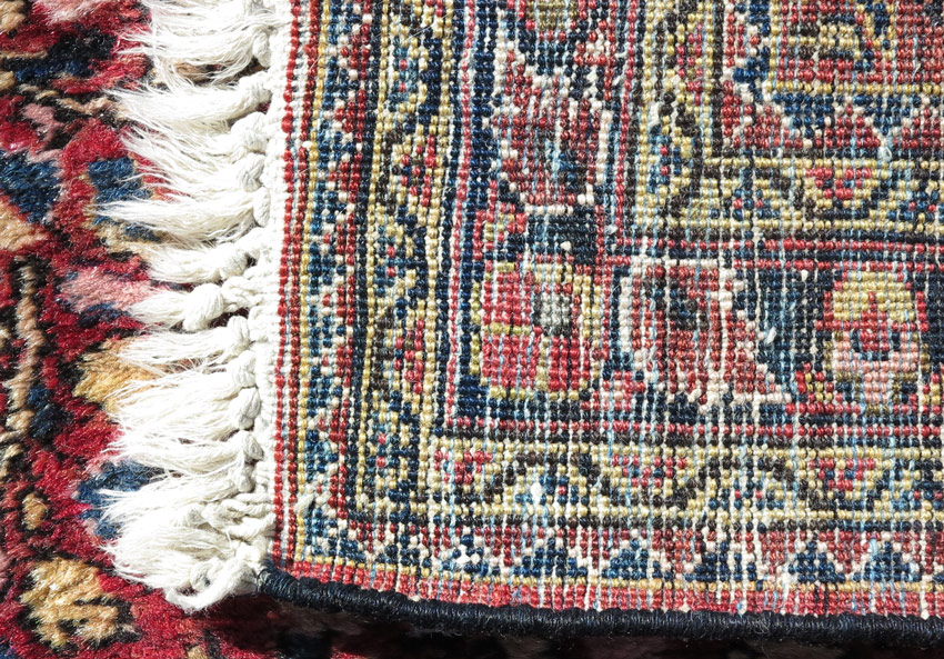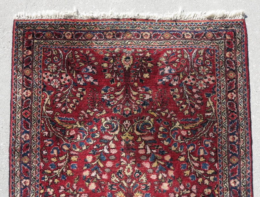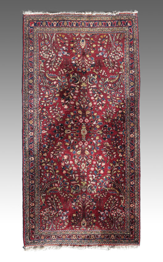SEMI-ANTIQUE PERSIAN SAROUK HAND KNOTTED WOOL RUG, 31 1/2'' x 57'': This Persian Sarouk has a fine weave and the traditional floral design of sprays of flowers in colors of blue, yellow, white, and black, on a red field. There are five borders, four guard borders and a main central border that has larger flower and leaf motifs in the colors used in the field. This would be a good entryway rug for someone with a room size Sarouk. Condition is good with some shading.
