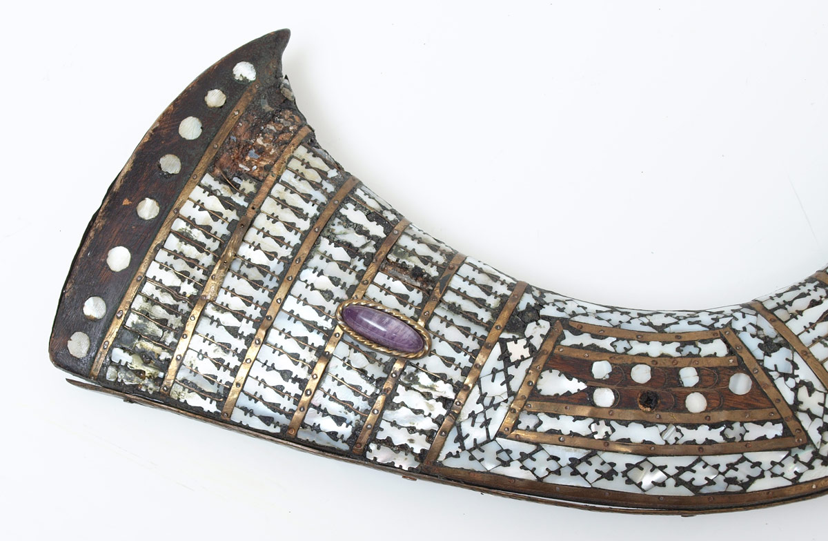 PERSIAN / AFGHAN INLAID JEZAIL MUSKET: Profusely inlaid with brass and mother of pearl with stone cabochons. English Tower lock marked with crown over C.R.. 42 3/4'' barrel with decorative designs, flared muzzle, 3 of the 5 original bands remaining. Action is frozen. Overall 57 1/2'' long.