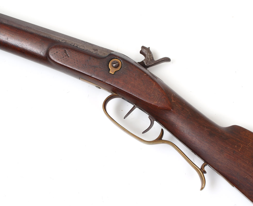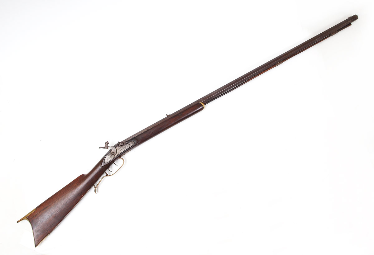 GREAT WESTERN GUNWORKS PERCUSSION RIFLE: Company founded in 1866 by James H. Johnson, partial makers stamp remains on 39 3/4'' octagon barrel. Brass furniture. Set trigger and action works but loose. Overall 56'' l.
