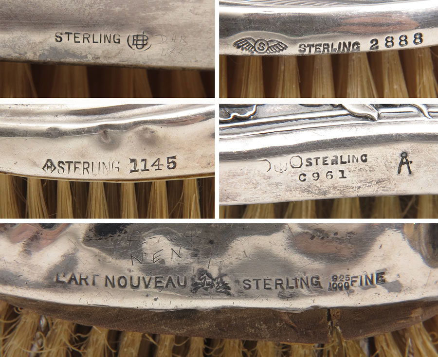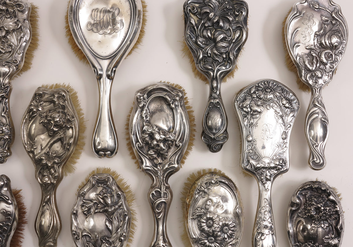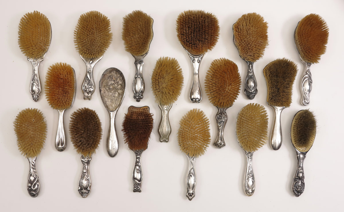 16 STERLING MOUNTED ART NOUVEAU HAIR BRUSHES: 17 pieces total, handled hair brushes, makers to include Shiebler, Unger Brothers, Mauser, Gorham, Kerr and others unknown. Sold with one non-sterling brush.