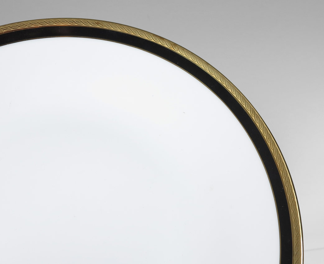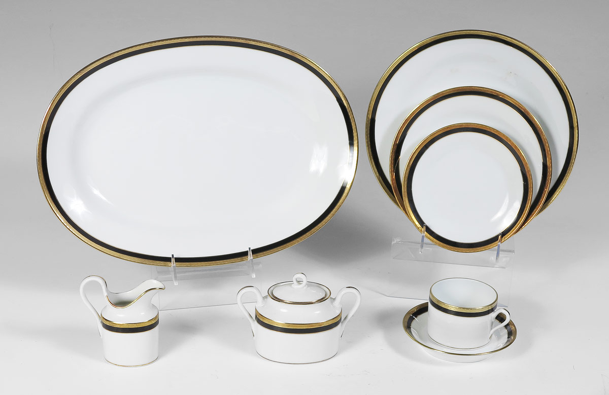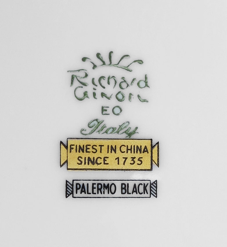 RICHARD GINORI ITALIAN BLACK PALERMO CHINA: 43 piece service for 8 to include 8 each of dinner plated (10 1/4''), salad plates (7 3/4''), bread plates, dessert bowls, creamer, covered sugar, and the 15 1/4'' platter.