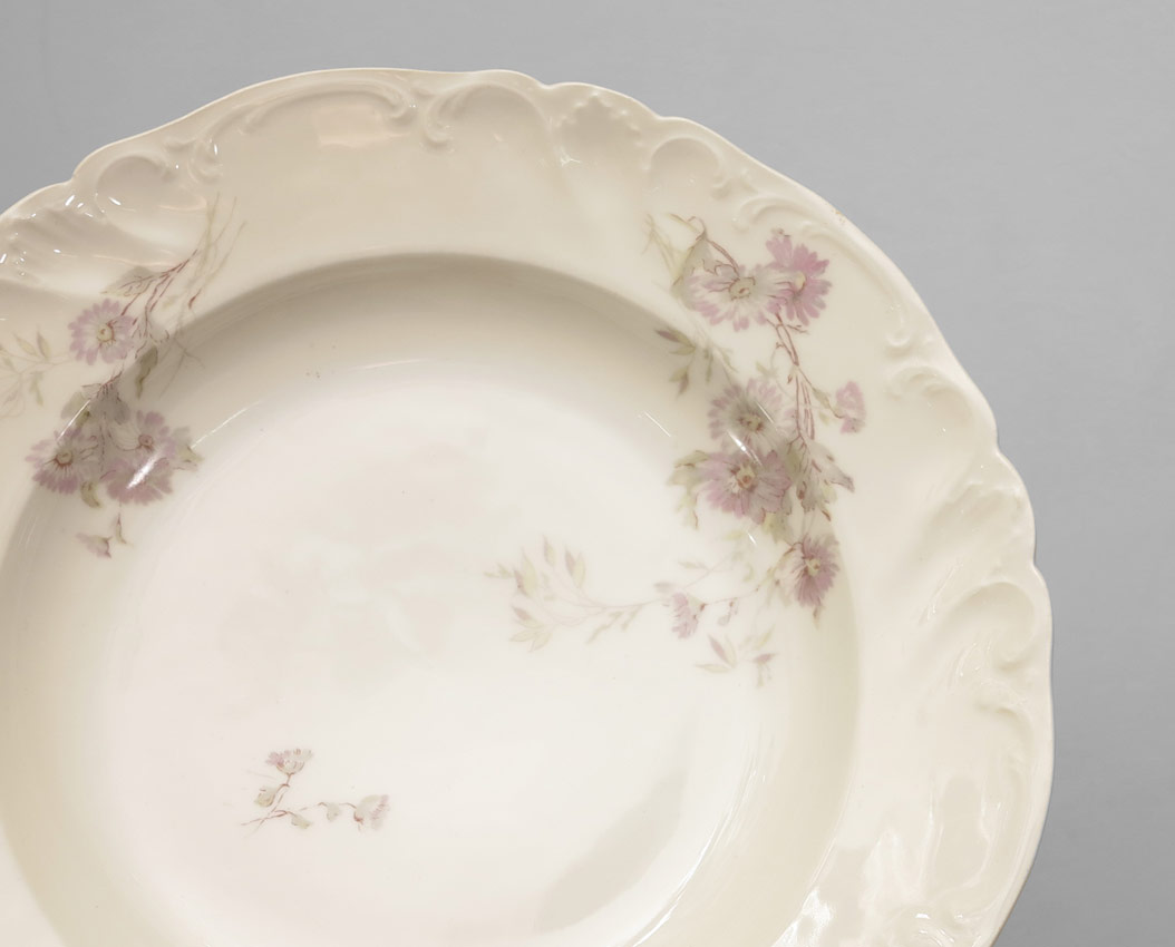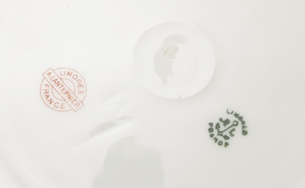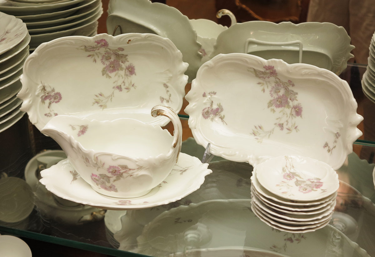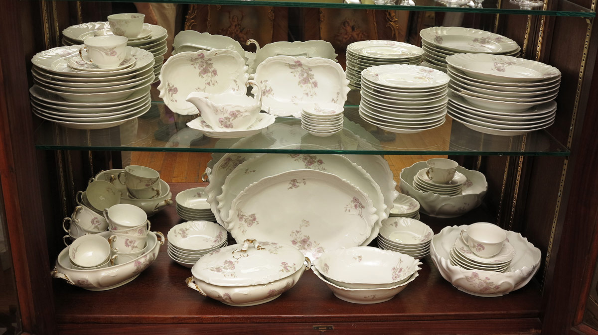 A. LANTERNIER LIMOGES CHINA SERVICE: Approx. 85 pieces in a pink floral pattern by A. Lanternier, Limoges France to include 10 dinner plates (10''), 10 salad plates (7 3/4''), 11 soup bowls, 12 dessert bowls, 11 teacups and saucers, 3 platters (largest 18 1/2'' x 13 1/4''), covered vegetable, open vegetable, gravy or sauce boat and underplate, 8 small plates (3 1/2''), large serving bowl (3 3/4'' x 10''), 2 oval serving bowls, 2 open butter dishes.