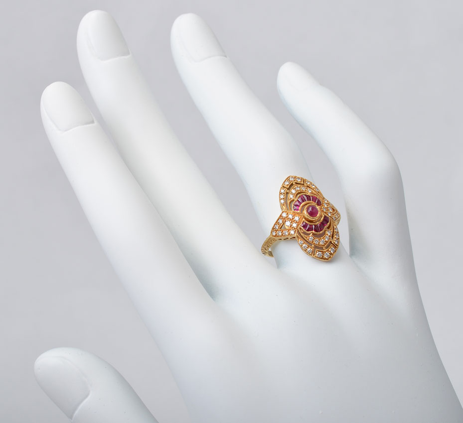 18K RUBY AND DIAMOND RING: 18K yellow gold ring contains 13 cabochon cut rubies totaling approx. .64 Ct. and 50 round full cut diamonds totaling approx. .51 Ct. The diamonds average VS in clarity and H-I in color. The rubies are bezel and channel set. The diamonds are bead set. Size 6. Weight: 3.7 grams.