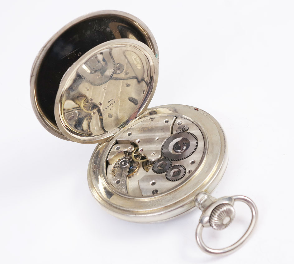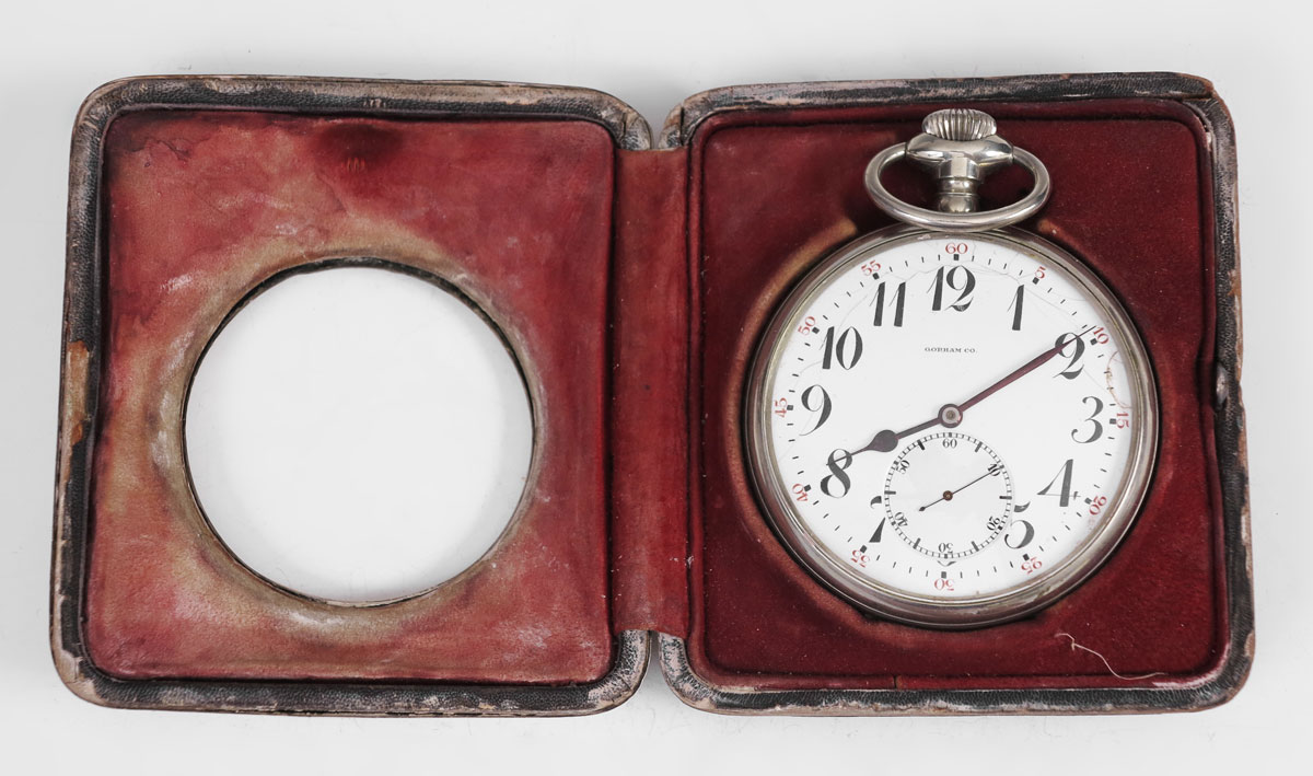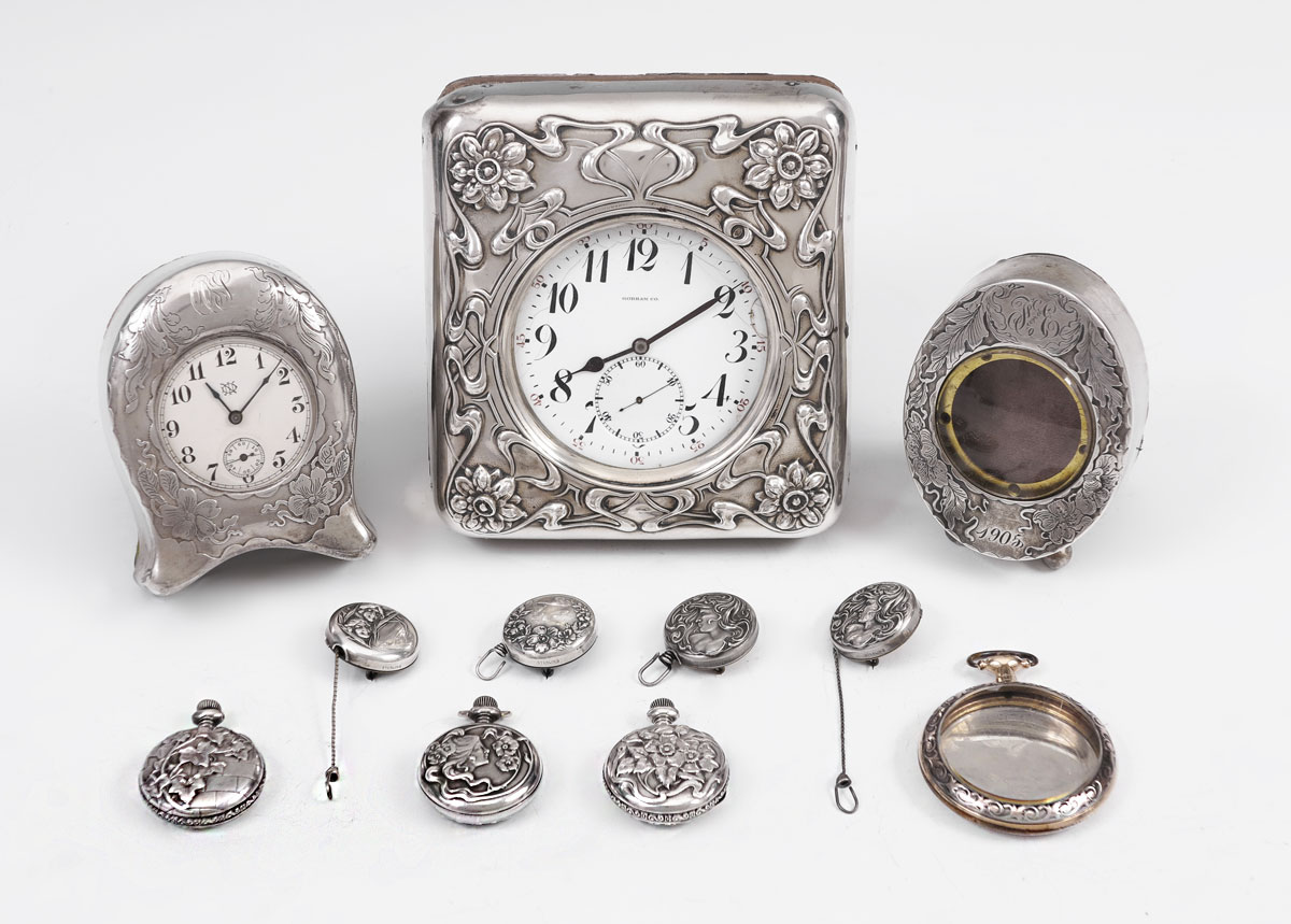 ART NOUVEAU STERLING CLOCKS, WATCHES AND ACCESSORIES: 11 pieces total to include 1) Gorham Sterling face faced watch case with Gorham pocket style watch / clock inside. Movement marked Gorham, case of watch not sterling. Hairlines to face. 5'' x 4'' x 1 5/8''. 2) I.N. Deitsch travel clock, sterling front, felt back. 3) I. N. Deitcsh travel clock, no movement, dated 1905. 4) 3 sterling case small pocket watches, marked NE in heart, one missing hands. 5) Star W.S. Co. sterling case, no movement. 6) 4 Ketchum & McDougall pull chains, 2 with same design.