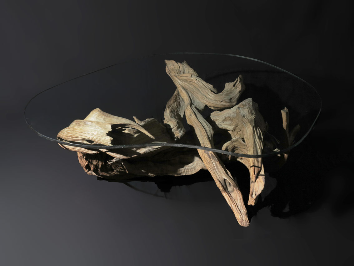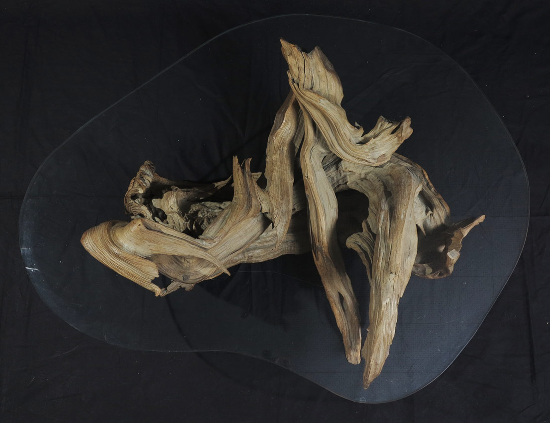 GLASS TOP DRIFTWOOD COFFEE TABLE: Shaped glass top over driftwood base. Overall 14 1/4'' h. x 44'' x 35''.