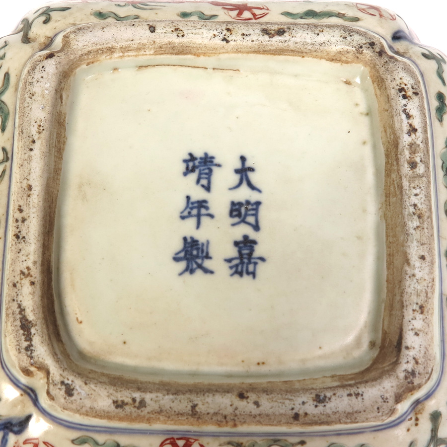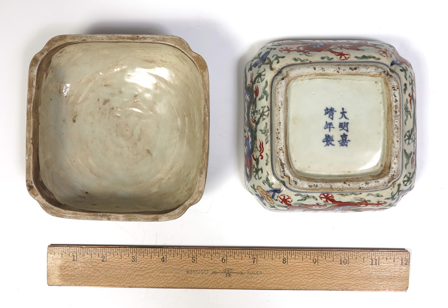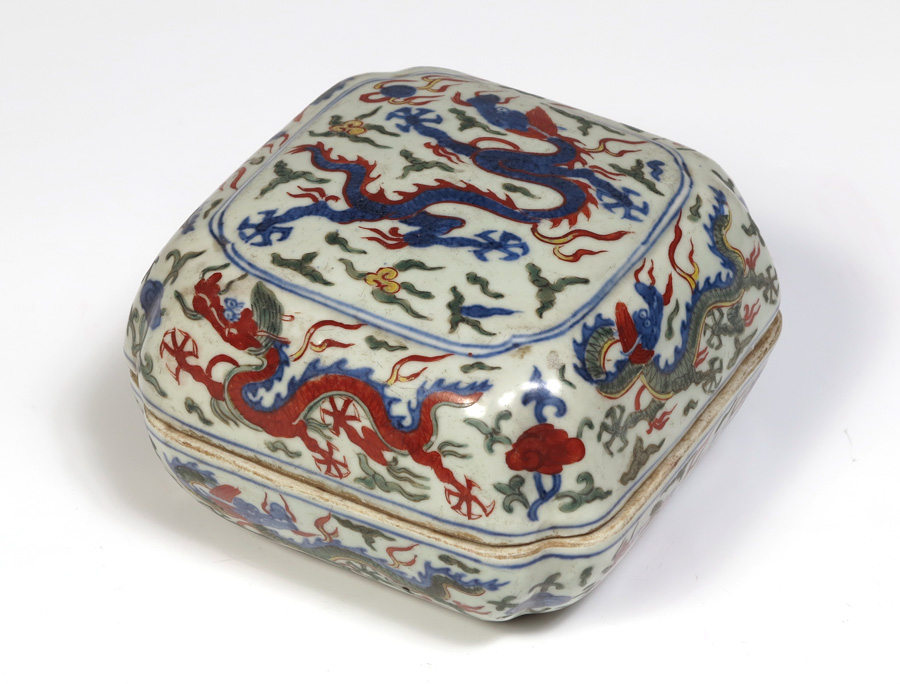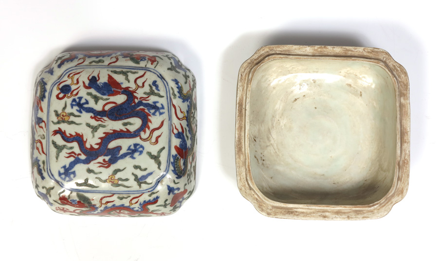 CHINESE POLYCHROME CERAMIC COVERED BOX: Four color dragon decorated covered box. Measures approx. 2 1/4'' tall x 5''. Actual age unknown.