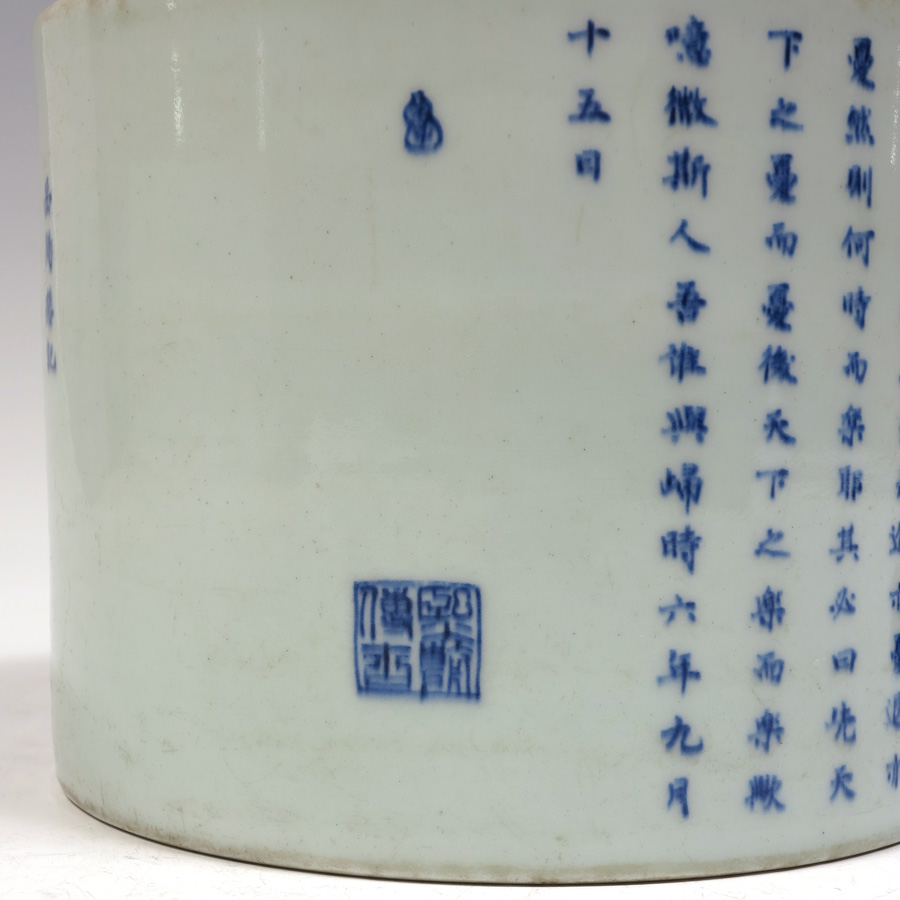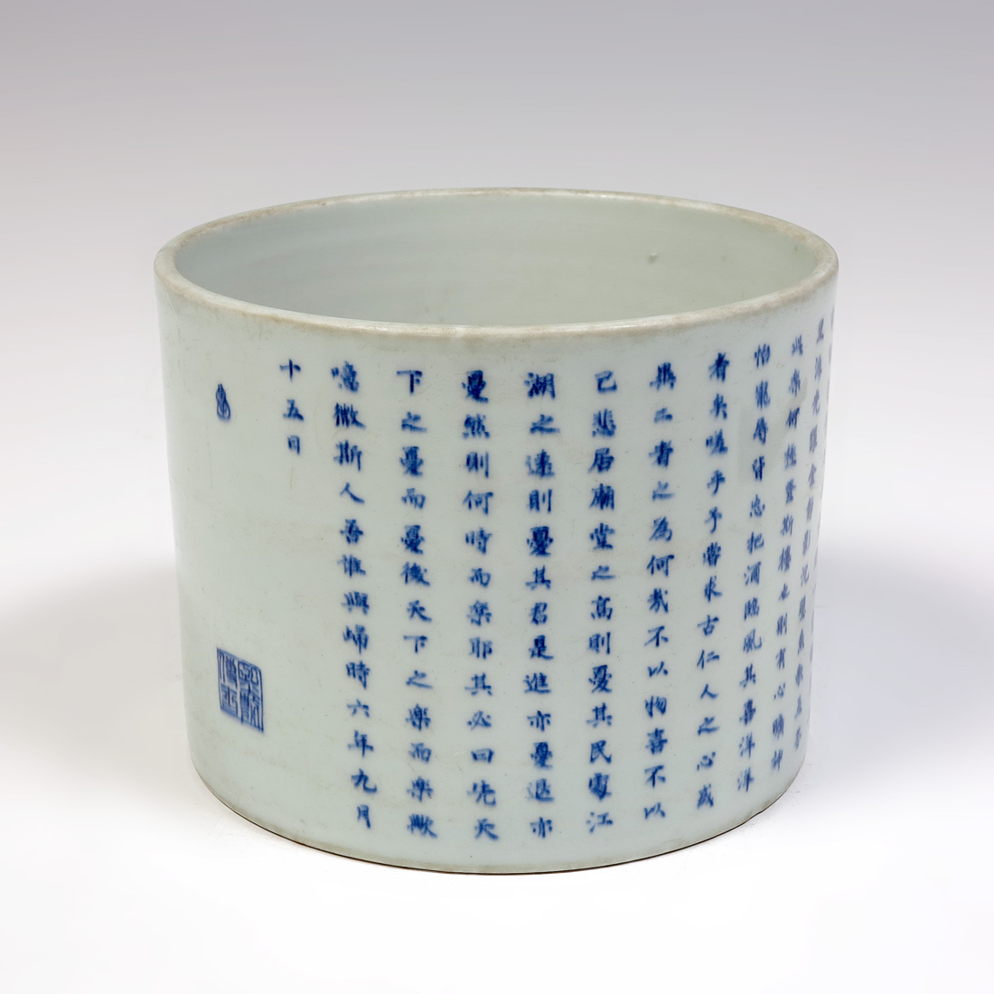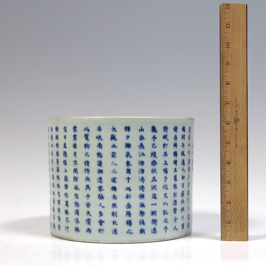 CHINESE CERAMIC BLUE DECORATED BRUSH POT: Scholarly organizer, 6 1/4'' tall x 8'', Blue character marks. Actual age unknown.