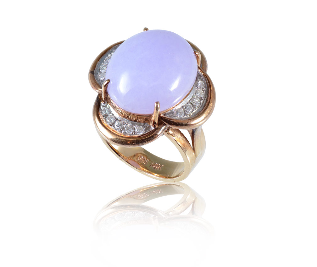 14 KT GOLD & LAVENDER JADEITE JADE RING: 14k yellow gold ring centers one cabochon cut lavender piece of jadeite, approx. 17.57 Ct. Framed by 20 full cut diamonds totaling approx. .32 Ct. Size 6. Weight 12.7 grams.