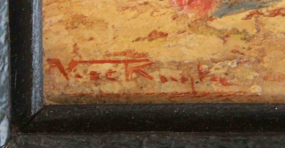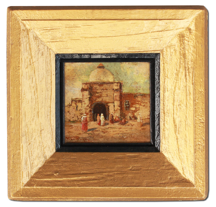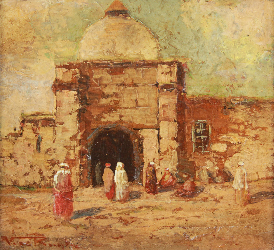 RUYTER, Victor, (German, 1870- ): Orientalist Scene with Figures Outside a Mosque, Oil/Board, signed lower left, painted and gilded frame, 9'' x 9 1/2''.